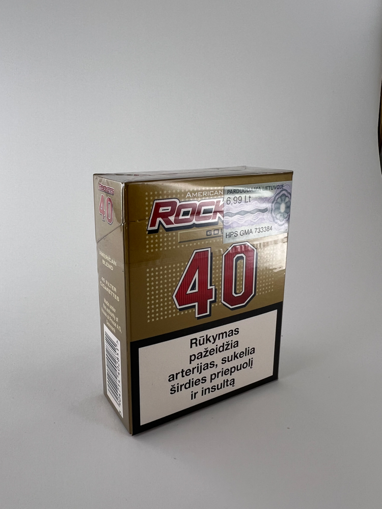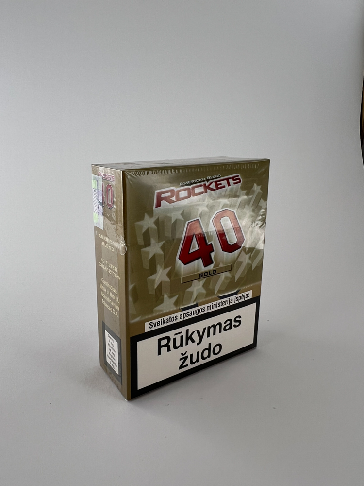 „Rockets 40 Gold“ is a cigarette pack of a unique format, containing as many as 40 cigarettes – twice as many as in a regular pack. The gold background and the large red number „40“ with elements of the American flag and the inscription „American Blend“ suggest that this was a brand focused on the mass cheap market with a US stylistic image. The warnings are in Lithuanian. The pack has a price in litas, which indicates that it was sold in Lithuania even before the introduction of the euro (until January 1, 2015).