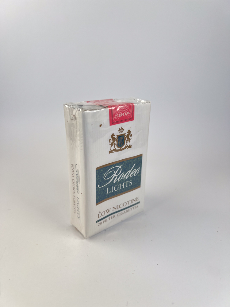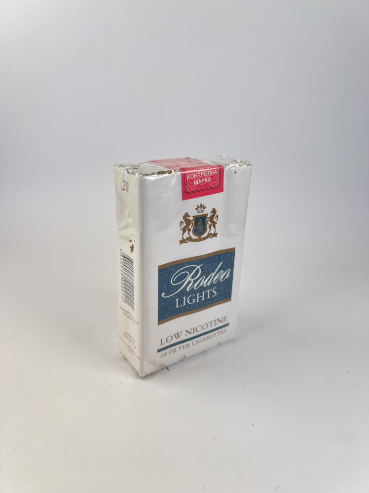 „Rodeo Lights – a classic cigarette pack made „Tutunski Kombinat Prilep (ТКП) tobacco factory in North Macedonia. The pack is white, with a blue central field, in which the „Rodeo Lights“ logo is highlighted. The top shows a coat of arms with two lions, a crown and a shield, symbolizing the factory emblem. On top is a pink excise control stamp with the Cyrillic inscription „Контролна марка“, typical of Macedonian production. The bottom part indicates „Low Nicotine“ and „20 Filter Cigarettes“, emphasizing the light nature of this variant. The design is subtle, with Western European influences, but maintaining a clear Balkan visual style.