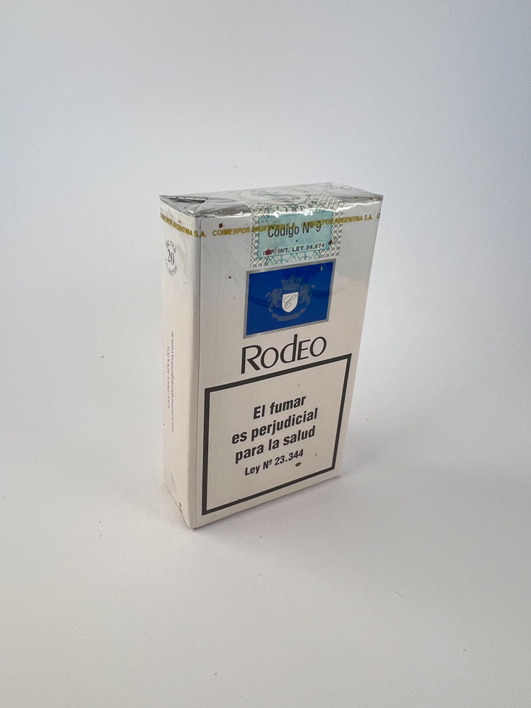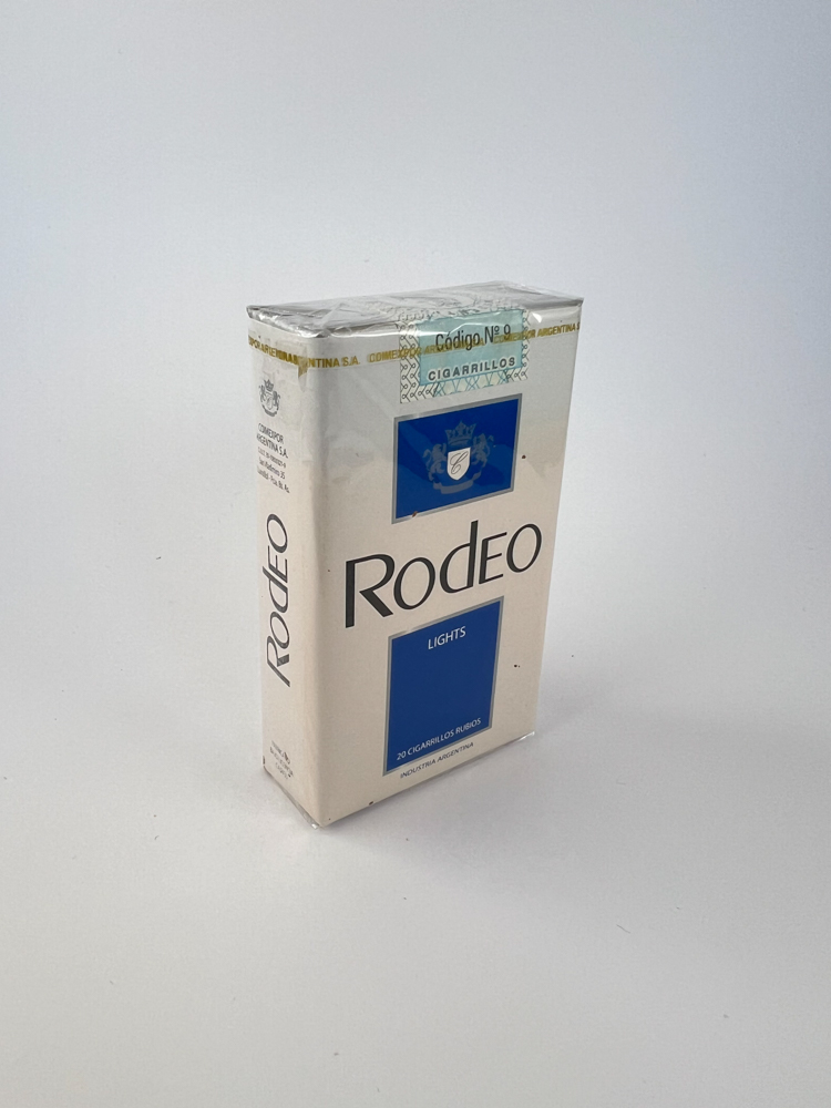 Description: This pack of Rodeo Lights cigarettes has a minimalist design, dominated by white and blue colors with a clear Rodeo logo. At the bottom is the word "Industria Argentina" and at the top is an excise sticker with the reference to the "Código Nº 9" campaign. On the back is a warning about the harms of smoking, in accordance with the law in force in Argentina, Ley Nº 23.344. The pack is intended for the local market and is manufactured by Comexport Argentina SA.