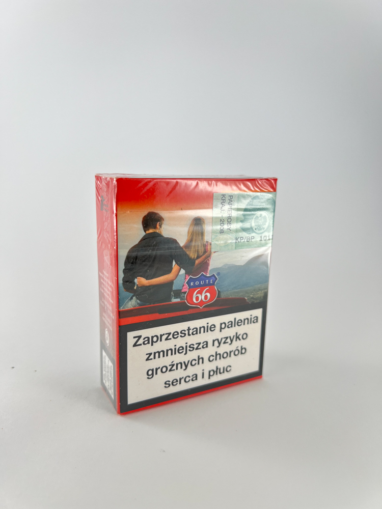 This is a collectible pack of Route 66 cigarettes, released with an iconic design inspired by the legendary US road. The bright red color, car design elements and the slogan "Enjoy the Ride!" convey the romance of the American lifestyle. On the back side, a couple of lovers looking at the horizon, further enhancing the impression of travel, freedom and adventure. The warnings are presented in Polish, with an authentic Polish excise stamp, marked in 2008. This is one of the rarer designs in the Route 66 series.