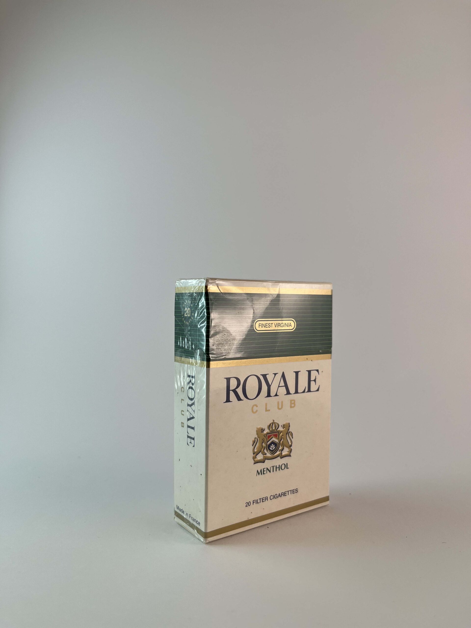 Description: The Royale Club Menthol cigarette pack has a classic design, dominated by white and green with gold details. The packaging has a minimalist style with the inscription "Finest Virginia", emphasizing the quality of the tobacco. The menthol flavor gives this product a freshness that may appeal to those who prefer a milder taste. The health warnings are also prominently displayed to emphasize the risks of smoking tobacco.