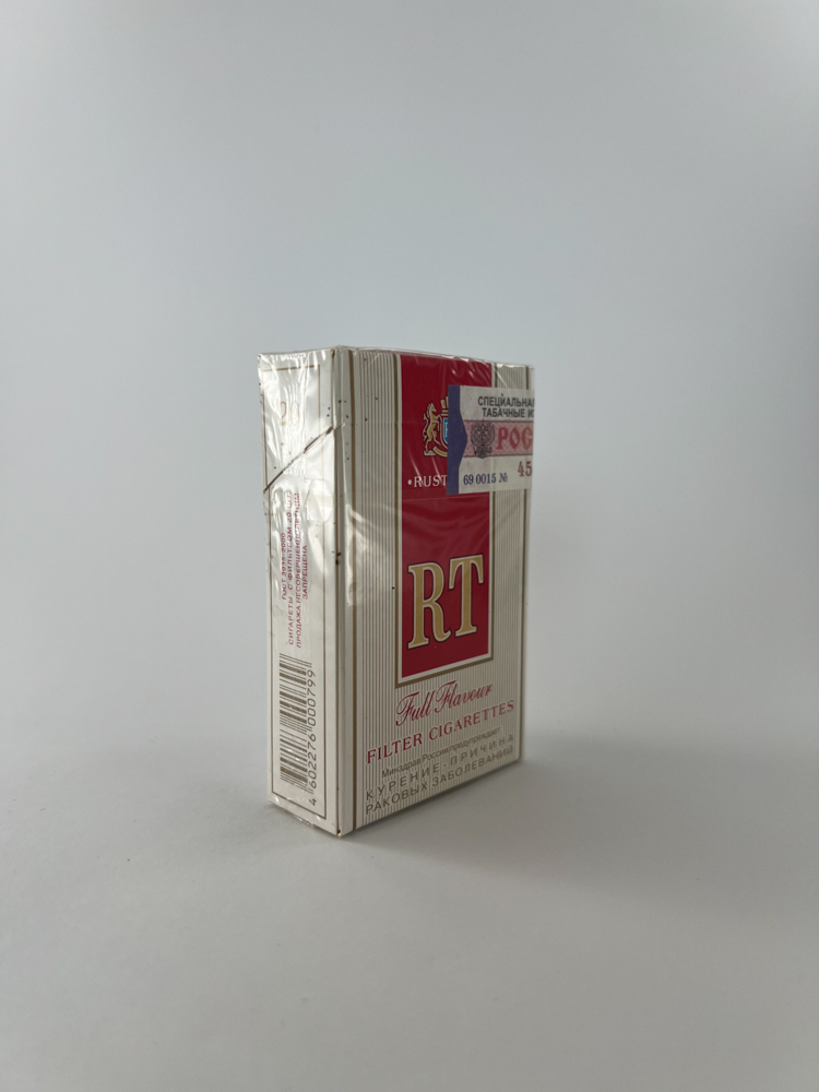 „RT“ (Rustabak) is one of the attempts of local Russian manufacturers to create a classic, Western-style cigarette image. The packaging is elegant, predominantly white with a bright red center and the gold-colored initials „RT“. The Rustabak logo is visible at the top, which indicates that this pack was produced by a Russian tobacco company operating around the mid-2000s. The fonts and vertical lines create a conservative, classic impression. The inscriptions in English („Full Flavor“, „Filter Cigarettes“) indicate an attempt to reach an export audience or at least give the product an international touch.