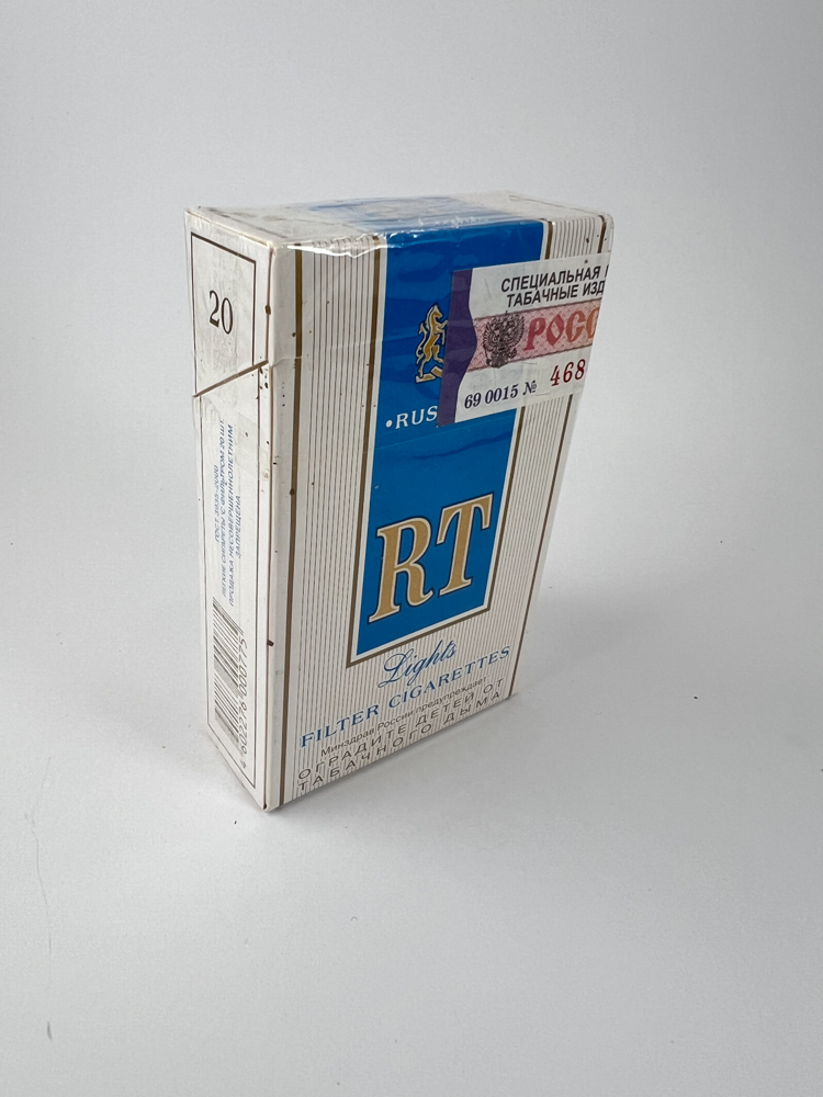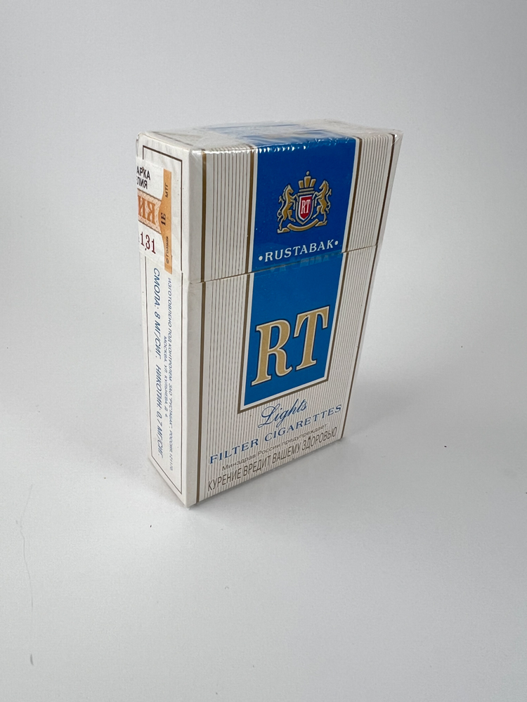 White and blue RT&Rustabak design with a coat of arms-like logo and a large „RT“ inscription. At the bottom – English „Filter Cigarettes“, and below – a Russian warning about harmfulness. On the side of the barcodes – lines of text in Russian. The seal is marked with a number, the inscription „РОССИЯ“. A beautifully balanced minimalist style that reflects the aesthetics of the production period.