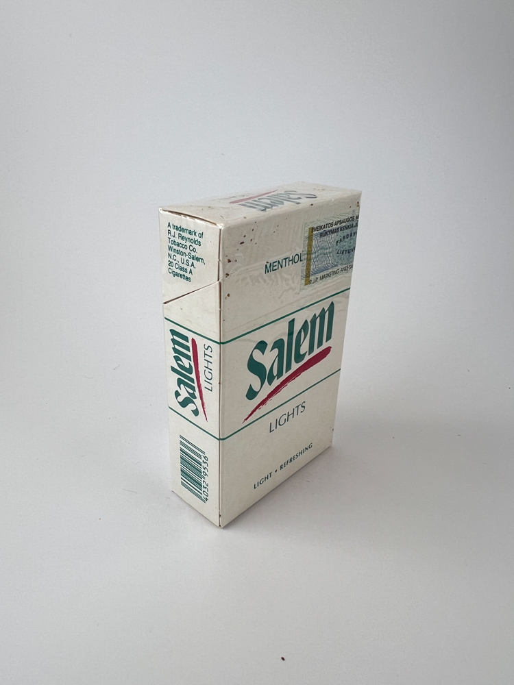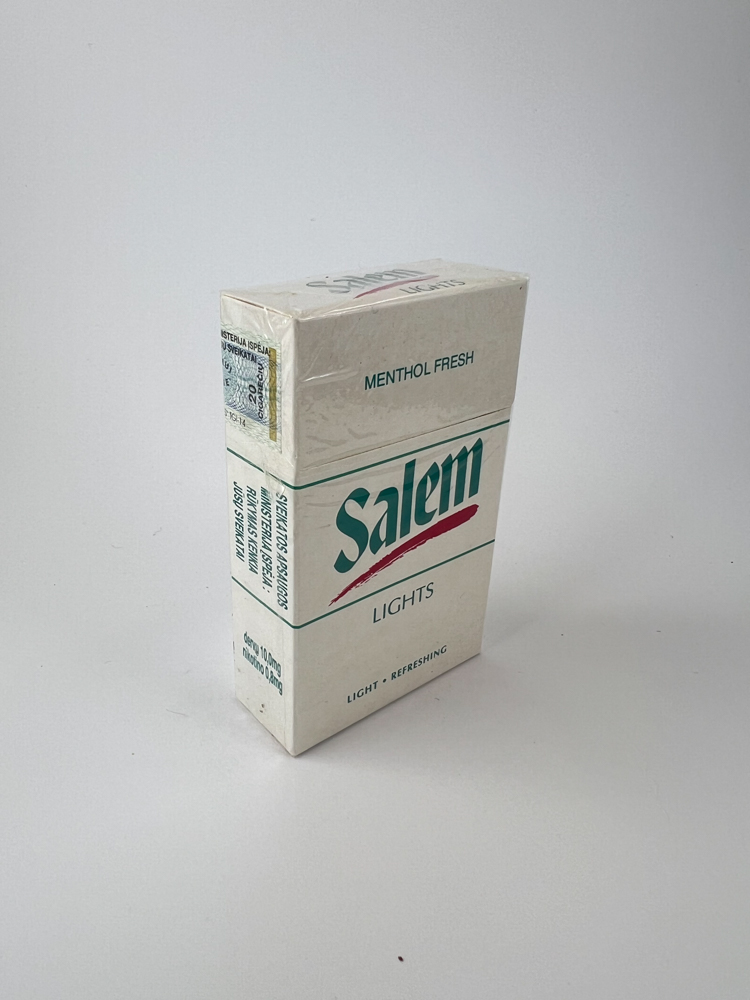 Description: This Salem Lights pack has a classic design, predominantly white with a green logo and a red stroke highlighting the brand. The marking "MENTHOL FRESH" at the top indicates that these are menthol-flavored cigarettes, and the inscription "LIGHT + REFRESHING" emphasizes the mild taste. The pack was imported to Lithuania, with an authentic excise stamp and warnings in Lithuanian. It belongs to RJ Reynolds Tobacco Company, USA. The design is typical of American menthol cigarettes of the late 20th century.
