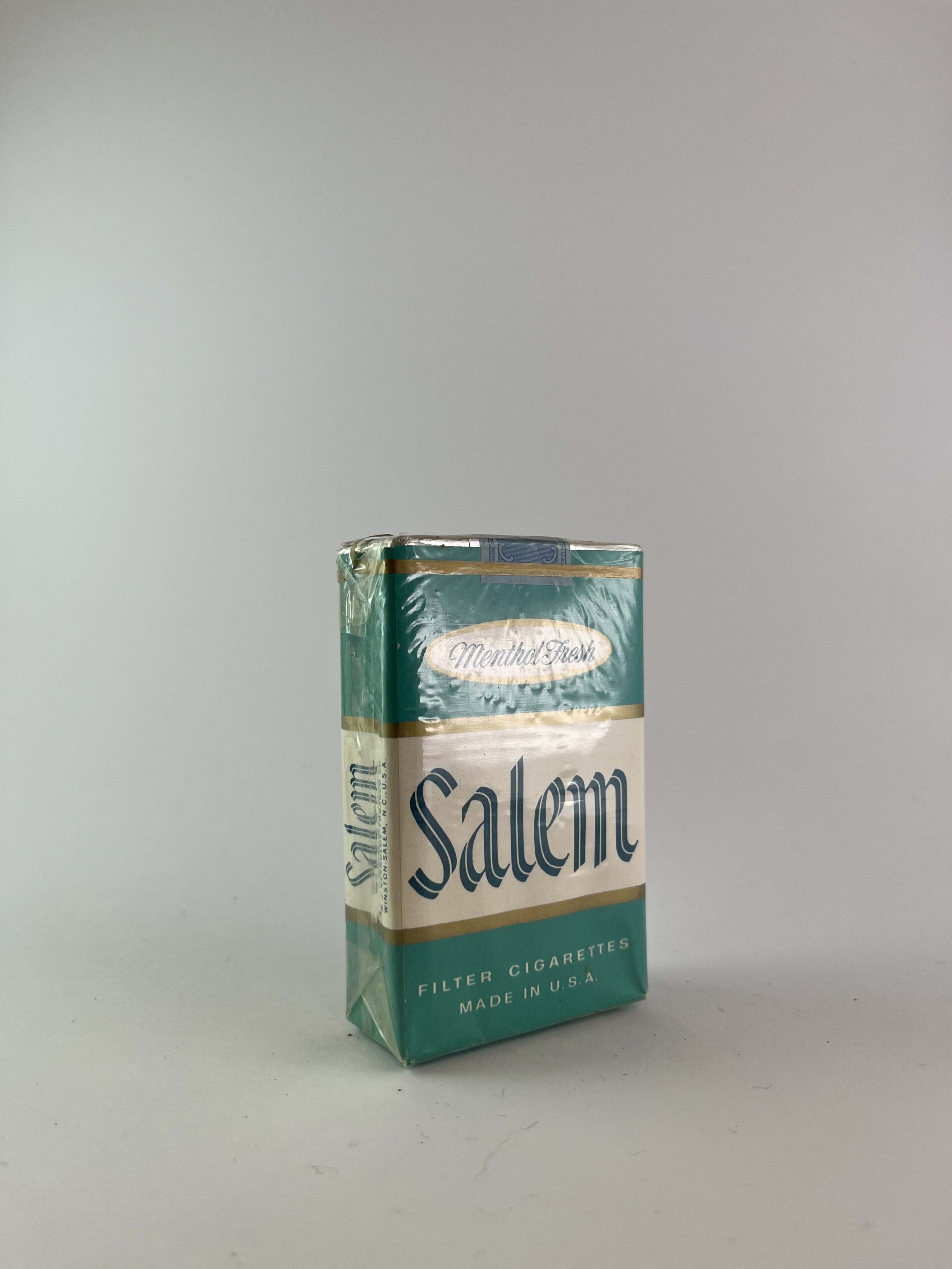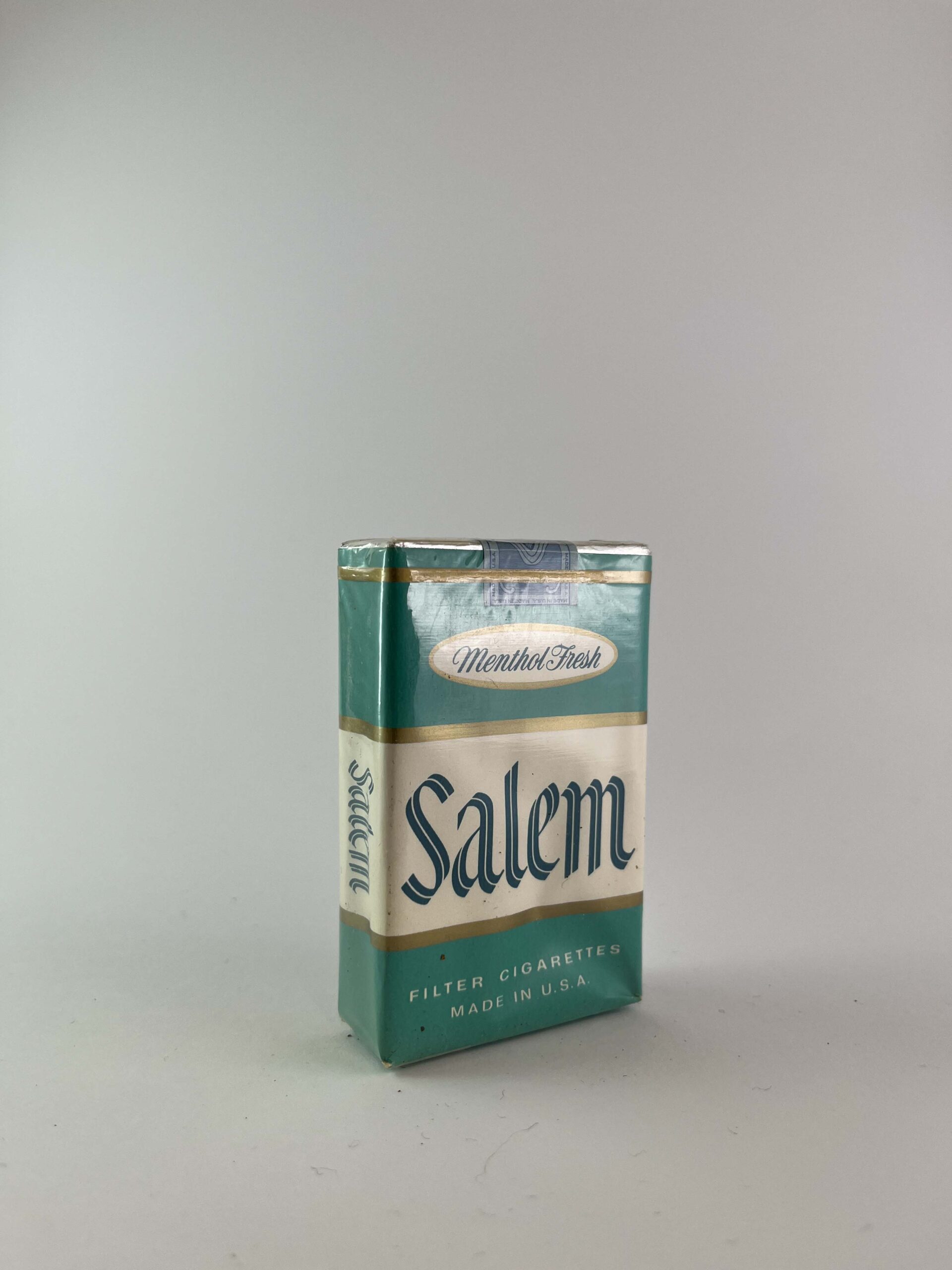 Description: Salem Menthol Fresh cigarette pack features a bright green and white color scheme that emphasizes the freshness and menthol sensation. This is one of the classic menthol flavor packs, extremely popular in its time. It is originally sealed, which increases its value in the eyes of collectors.