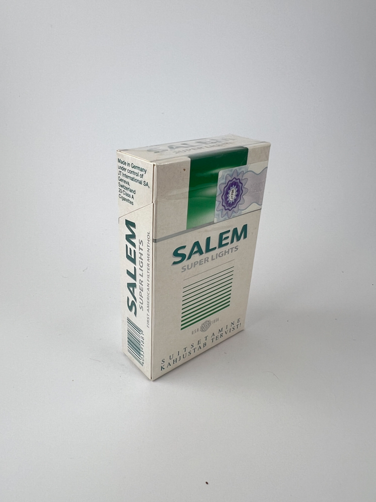 Description: This Salem Super Lights pack features a minimalist, light design with green stripes and a stylized logo in the center. The bottom of the pack contains a warning in Estonian „Suitsetamine äästätab tervist“, which suggests that this pack was intended for the Estonian market. The side shows that the production was carried out in Germany, under the control of JT International SA, a company registered in Switzerland. This is a classic menthol cigarette variant, the design of which is reminiscent of the international style of the late 20th and early 21st centuries.