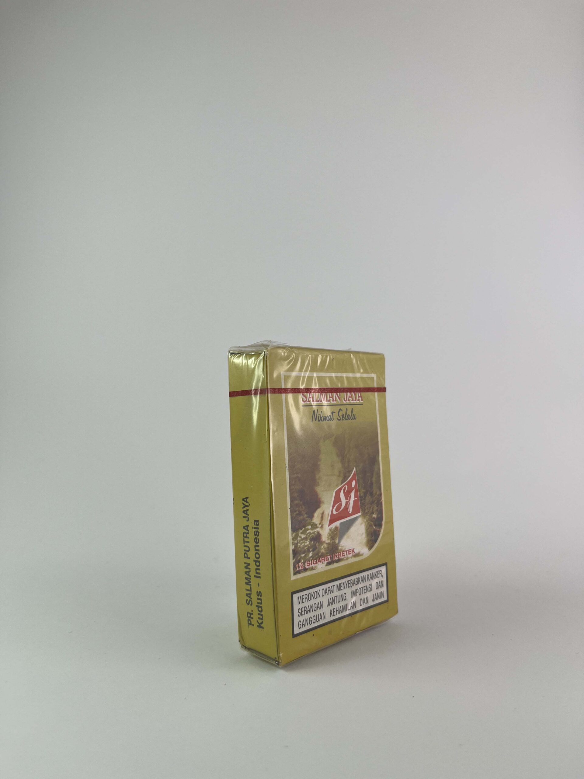 Aprašymas: Šis Salman Jaya cigarečių pakelis yra paprasto ir klasikinio dizaino su auksiniu fonu ir išskirtiniu raudonu „SJ“ logotipu. Šio prekės ženklo cigaretės yra gerai žinomos Indonezijoje ir vertinamos dėl tradicinio skonio, kurį suteikia kretek tipo tabakas su gvazdikėlių aromatu. Įspėjimas apie rūkymo žalą yra pateiktas pakelio apačioje, pabrėžiant sveikatos pavojus.