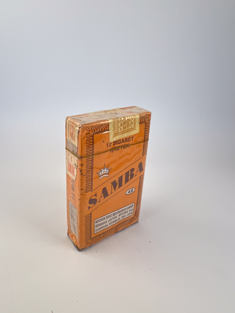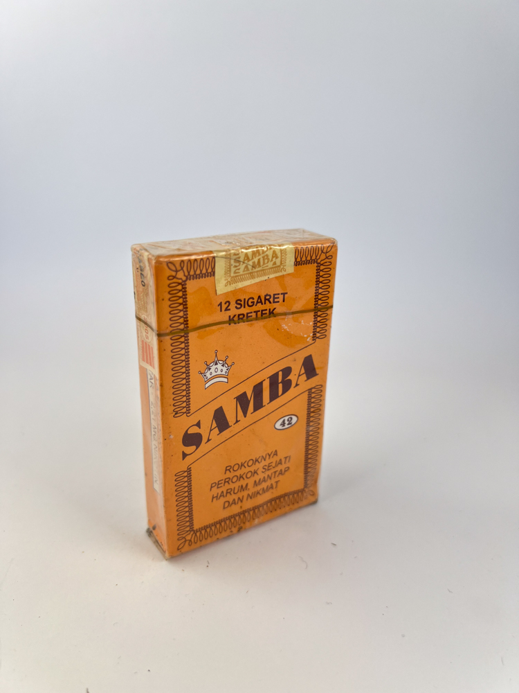 „Samba 42“ – tai klasikinis Indonezijos kretek (gvazdikinių) cigarečių pakelis, pasižymintis ryškiu oranžiniu dizainu ir paprastu, tačiau energingu vizualiniu stiliumi. Pakelio centre – prekės ženklas „Samba“, papildytas karūnos simboliu, kuris suteikia šiam leidimui lengvo prestižo atspalvį. Užrašai indoneziečių kalba pabrėžia kvapnų ir malonų dūmą („Harum, Mantap dan Nikmat“ – „Kvapus, sodrus ir malonus“).