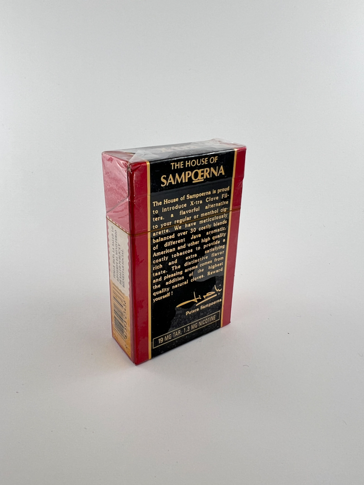 Description: This Sampoerna "X-tra" pack is in rich red and black with gold details. The front features the "X-tra" logo, and the Sampoerna brand name, one of Indonesia's oldest tobacco manufacturers, is printed on the top. The back details the production and flavor of these kretek (clove) cigarettes. The tar and nicotine concentration are also listed: 19 mg tar, 1.3 mg nicotine. The sides feature text in English and information that the pack is intended for "sale prohibited" markets, i.e. possibly diplomatic or duty-free shops. This is an exclusive variant outside Indonesia.