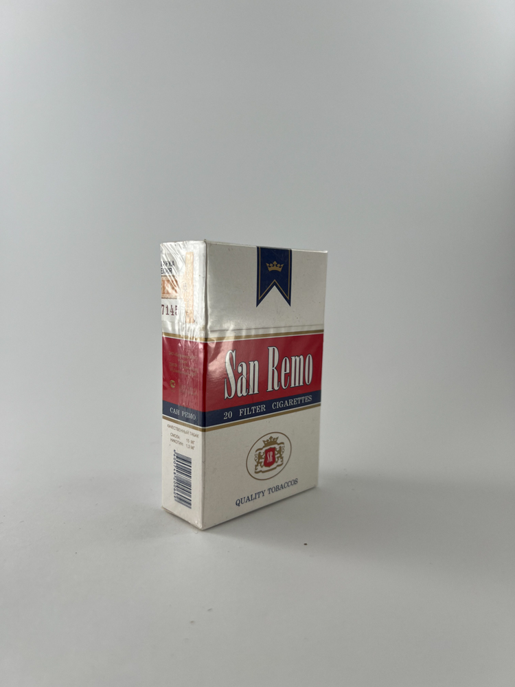 „San Remo“ cigarečių pakelis pasižymi klasikinio stiliaus dizainu, primenančiu europietišką aristokratišką liniją. Pakelio spalvinė schema – balta, raudona ir mėlyna – su karūnos simboliu viršuje bei herbo motyvais apačioje, skirta pabrėžti „kokybės tabako“ įvaizdį. Užrašas „Quality Tobaccos“ ir išryškintas prekės pavadinimas suteikia pakeliui elegancijos. Pakelis neišpakuotas, su originalia rusiška akcizine banderole, kas parodo, kad tai buvo legaliai platinamas produktas Rusijos vidaus rinkoje.