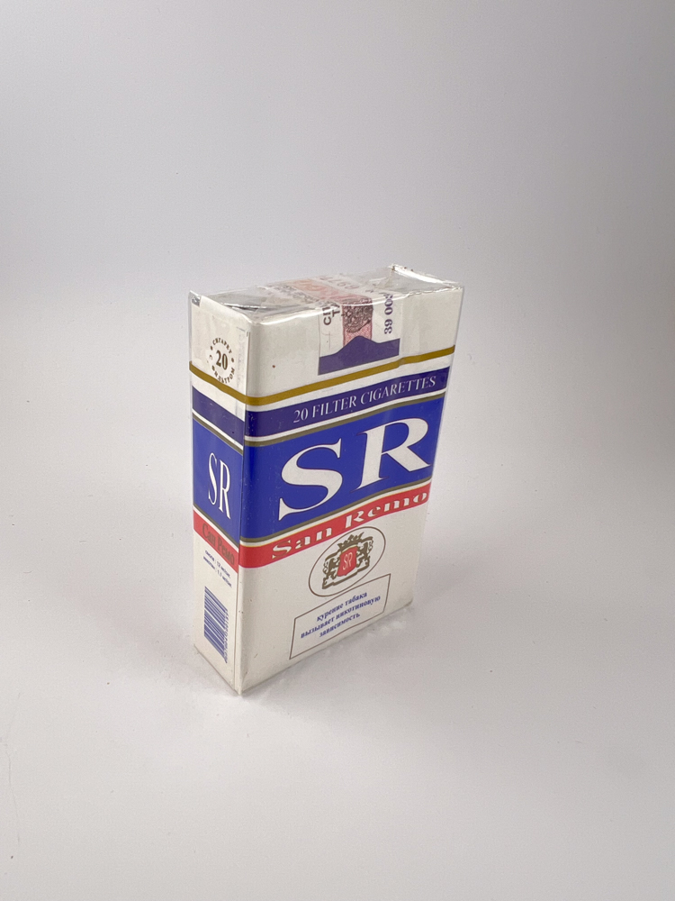 The main color scheme is – white, blue and red with gold details. On top is the inscription „"20 Filter Cigarettes"“, and below is the brand name San Remo with coat of arms and initials SR.