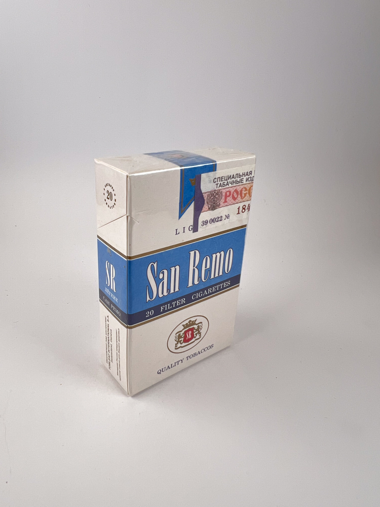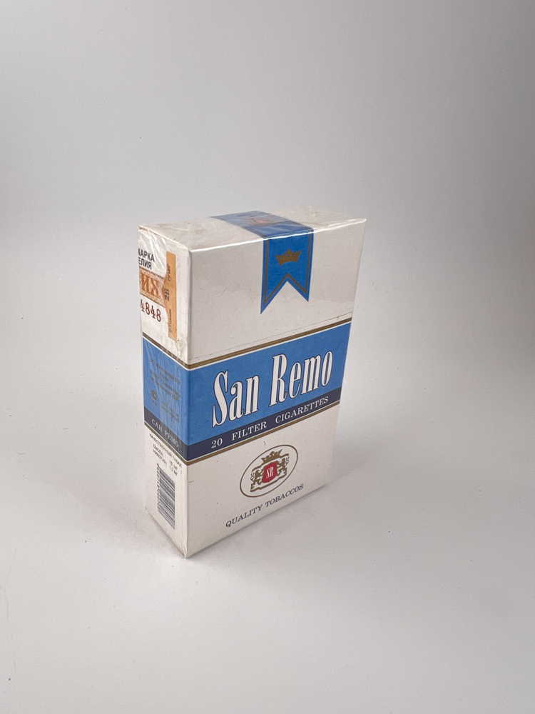 White and blue, elegant, classic-style package with a subtle coat of arms and inscription „San Remo“ lengthwise in the middle. At the top is a blue stripe with a crown, symbolizing high quality, and at the bottom is a coat of arms with the initials „"SR"“ and I write „"QUALITY TOBACCO"“.