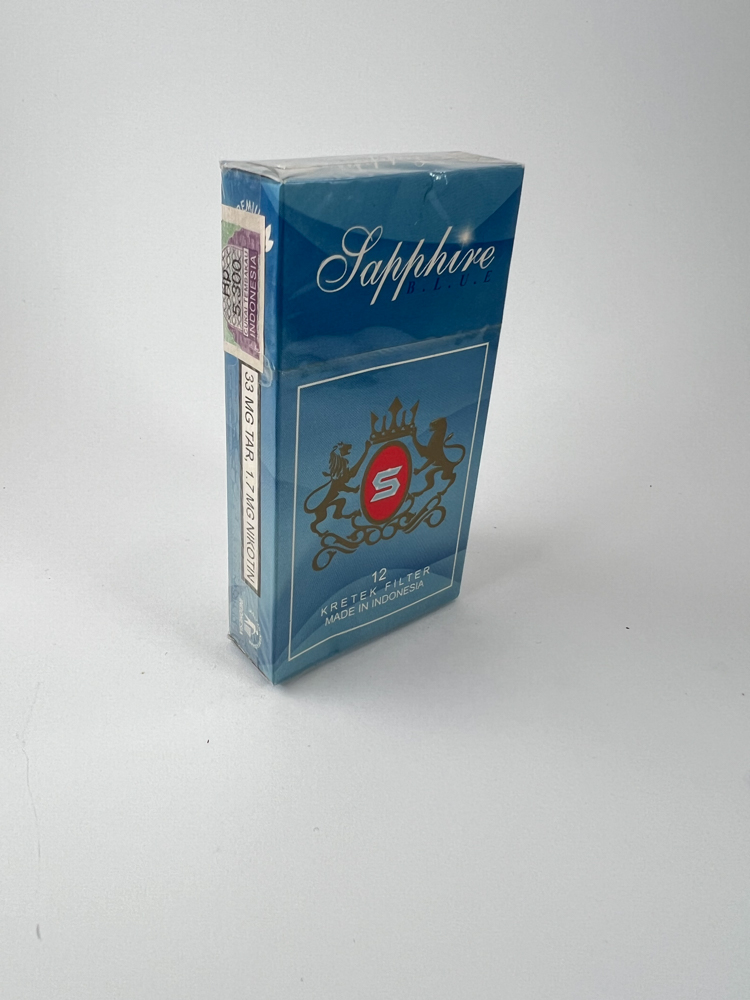 Pakuotė turi sodriai mėlyną spalvą („Sapphire Blue“) su minimalistiniu aukso ir raudono ženklo dizainu. Centre – herbinis simbolis su karūna ir liūtų figūromis, apačioje užrašas „12 Kretek T-Filter Made in Indonesia“. Ant šono yra nurodyta „33 mg tar, 1,7 mg nicotine“ bei sveikatos įspėjimas indonezų kalba („MEROKOK DAPAT MENYEBABKAN KANKER…“). Dizainas griežtas, tradicinis kretek vaizdas.