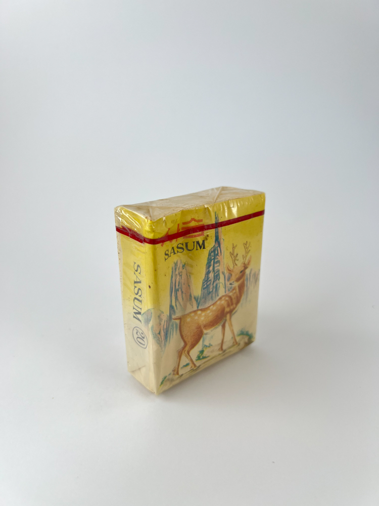 „"Sasum" is a North Korean cigarette pack, manufactured at a tobacco factory in Pyongyang. The front side shows the place of manufacture (Pyongyang, Korea), while the back side shows a nature drawing with a deer, which probably inspired the name of the pack - the word "sasum" means deer in Korean. The pack is covered with transparent cellophane, which is still intact. The minimalist and clear design with a typical socialist pattern gives it additional historical value.