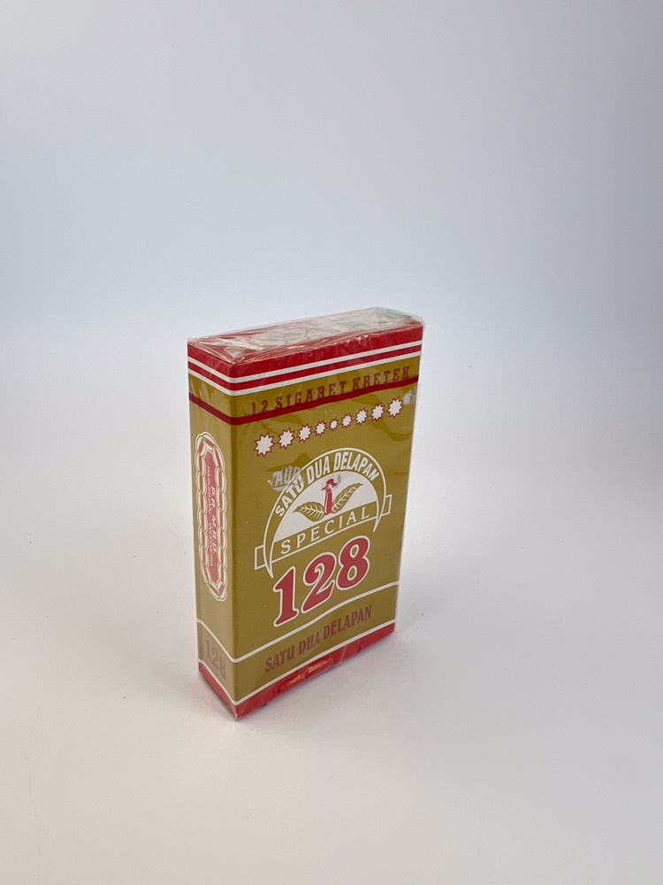 „Satu Dua Delapan“ (indonez. vienas du aštuoni – 128) yra klasikinis Indonezijos kretek cigarečių prekės ženklas, pasižymintis ryškiu retro stiliaus dizainu. Šis „Special“ leidimas naudoja šiltą garstyčių geltonumo foną su raudonais akcentais ir baltomis detalėmis – spalvų derinys, būdingas tradiciniams Kudus regiono tabako gamintojams.