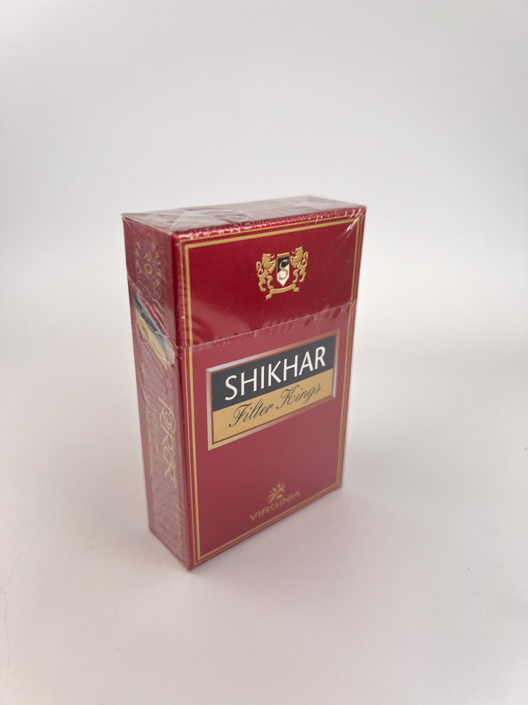 Dark red, solid package with gold trim and subtle shine. Name in the center SHIKHAR Filter Kings, presented on a black background with a gold frame that highlights the elegance of the brand. At the top is the classic coat of arms with two lions, and at the bottom is the word VIRGINIA, indicating the type of tobacco. The left side features a vertical inscription „Shikhar – Smoke in Sophisticated Style“, while the back side repeats the design with inscriptions in Hindi, which adds authenticity and local identity. The packaging is characterized by strict symmetry, clean typography and maintains a balance between tradition and modernity.