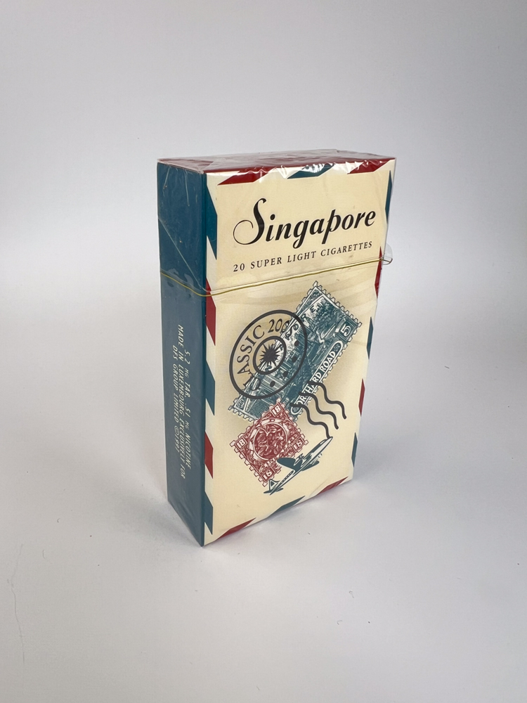 Inscription on the front side Singapore maintained in an elegant, slightly calligraphic font, with an instruction below it 20 Super Light Cigarettes, denoting a lighter type of tobacco product.