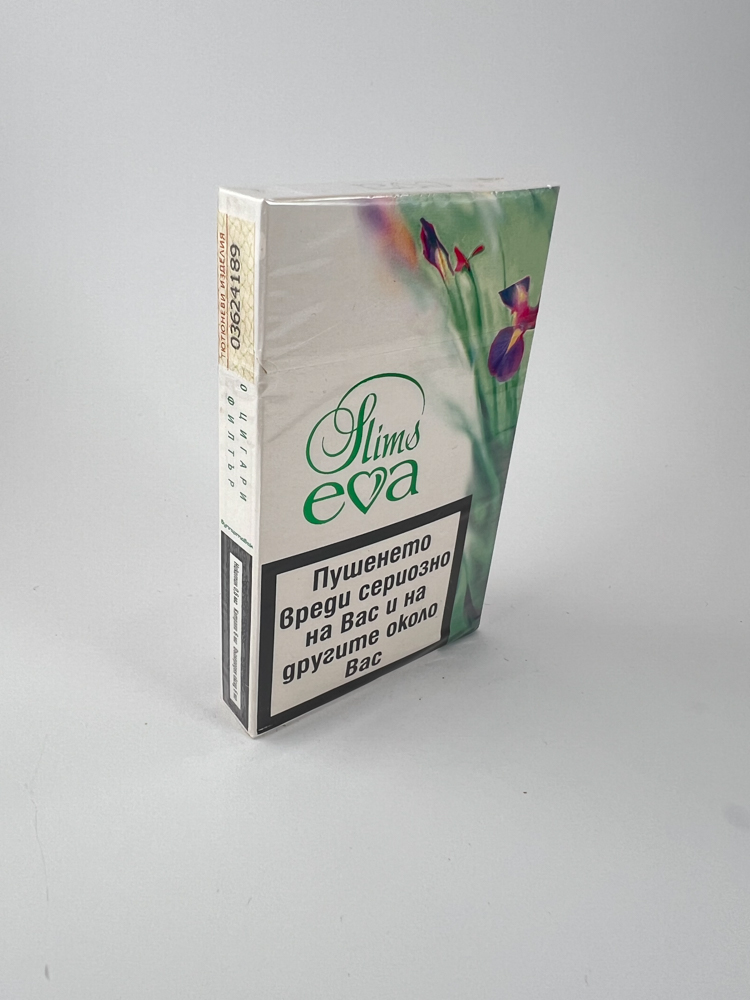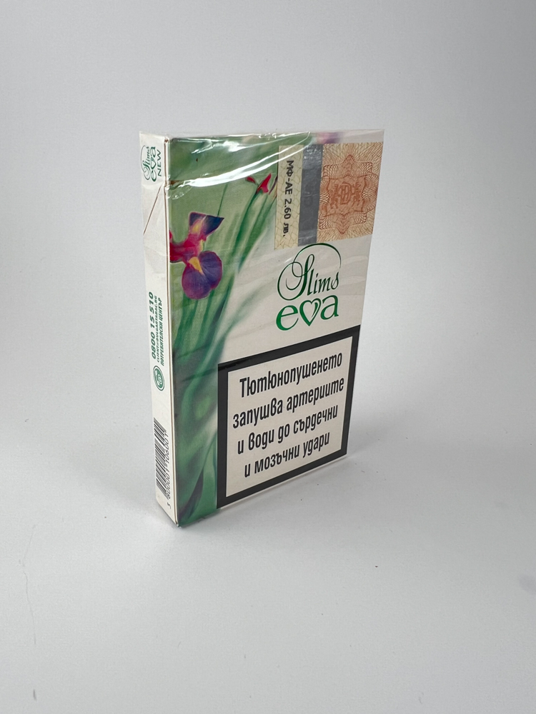 Description: A light cream package with a green flower motif, with a green "Slims eva" emblem in the center (stylization of a heart in the letter v). On the front and back – large Bulgarian health warnings, on the top – BG excise tax. On the sides – barcode and technical information. Condition: unopened, cellophane is sagging in places at the top, light corner pressure - overall very good.