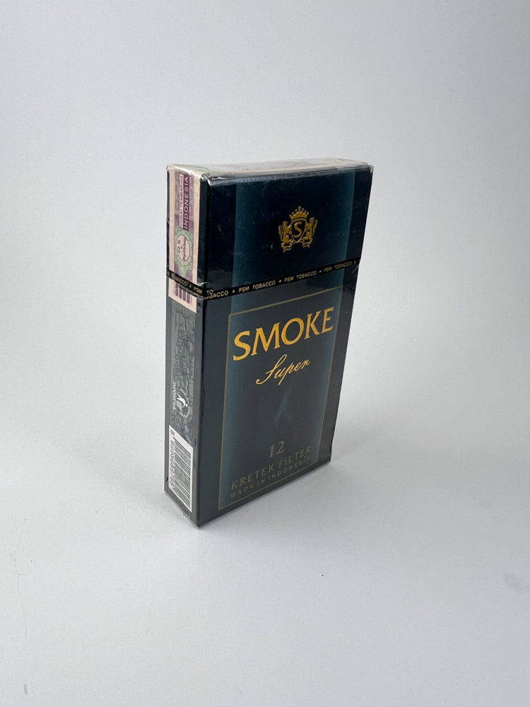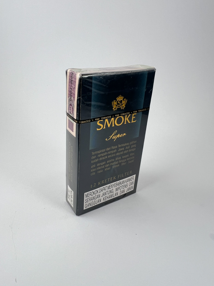 Smoke Super is an Indonesian kretek-type cigarette, characterized by a mixture of tobacco and cloves. The pack contains 12 filter cigarettes. The design is elegant, dark blue with gold letters "SMOKE Super" and a coat of arms symbol at the top. The back side contains a description of the manufacturer, emphasizing the quality of the tobacco and spices, as well as a warning about health risks. There is an Indonesian excise stamp on the side. The pack is unopened, in excellent condition.