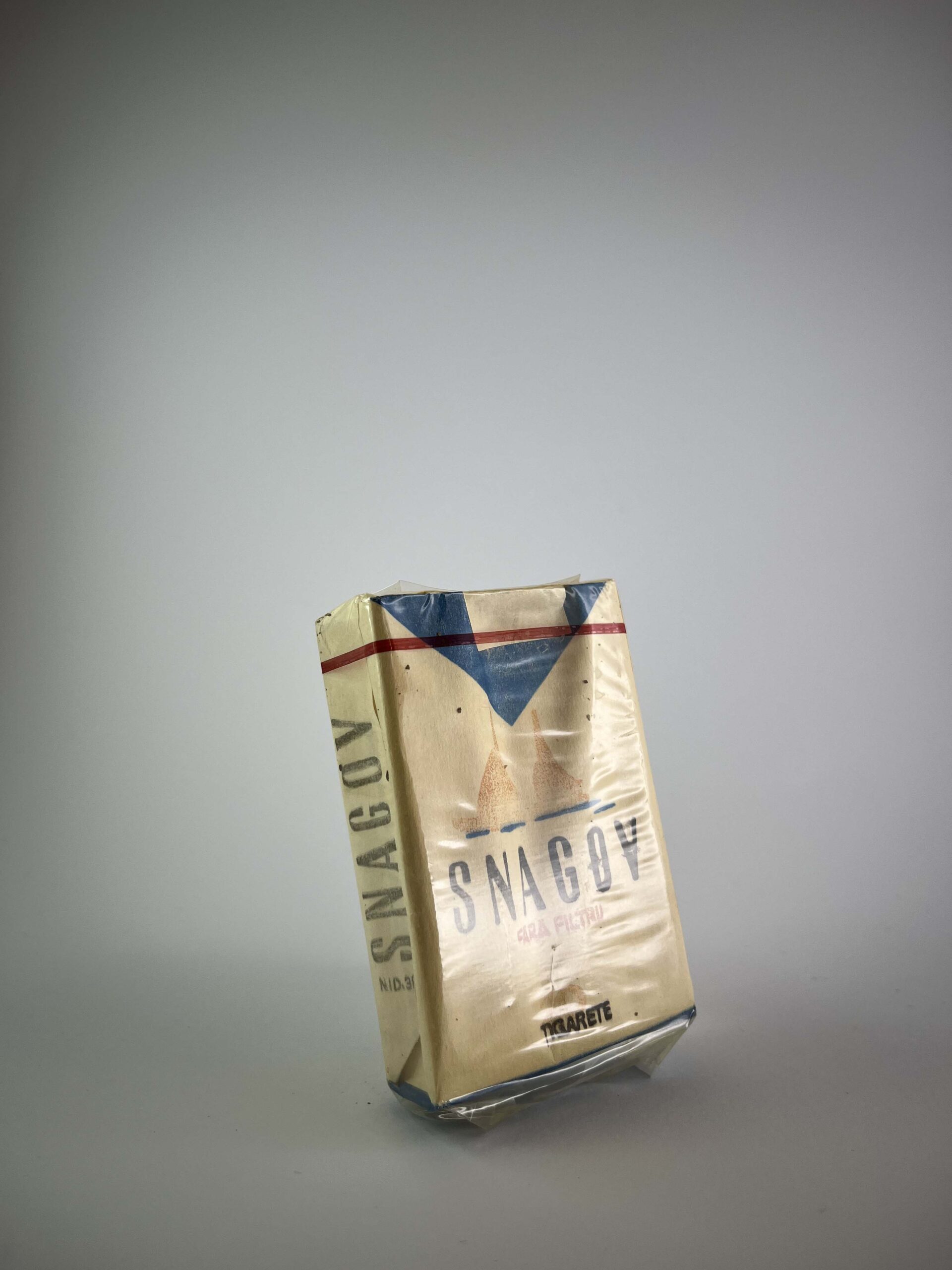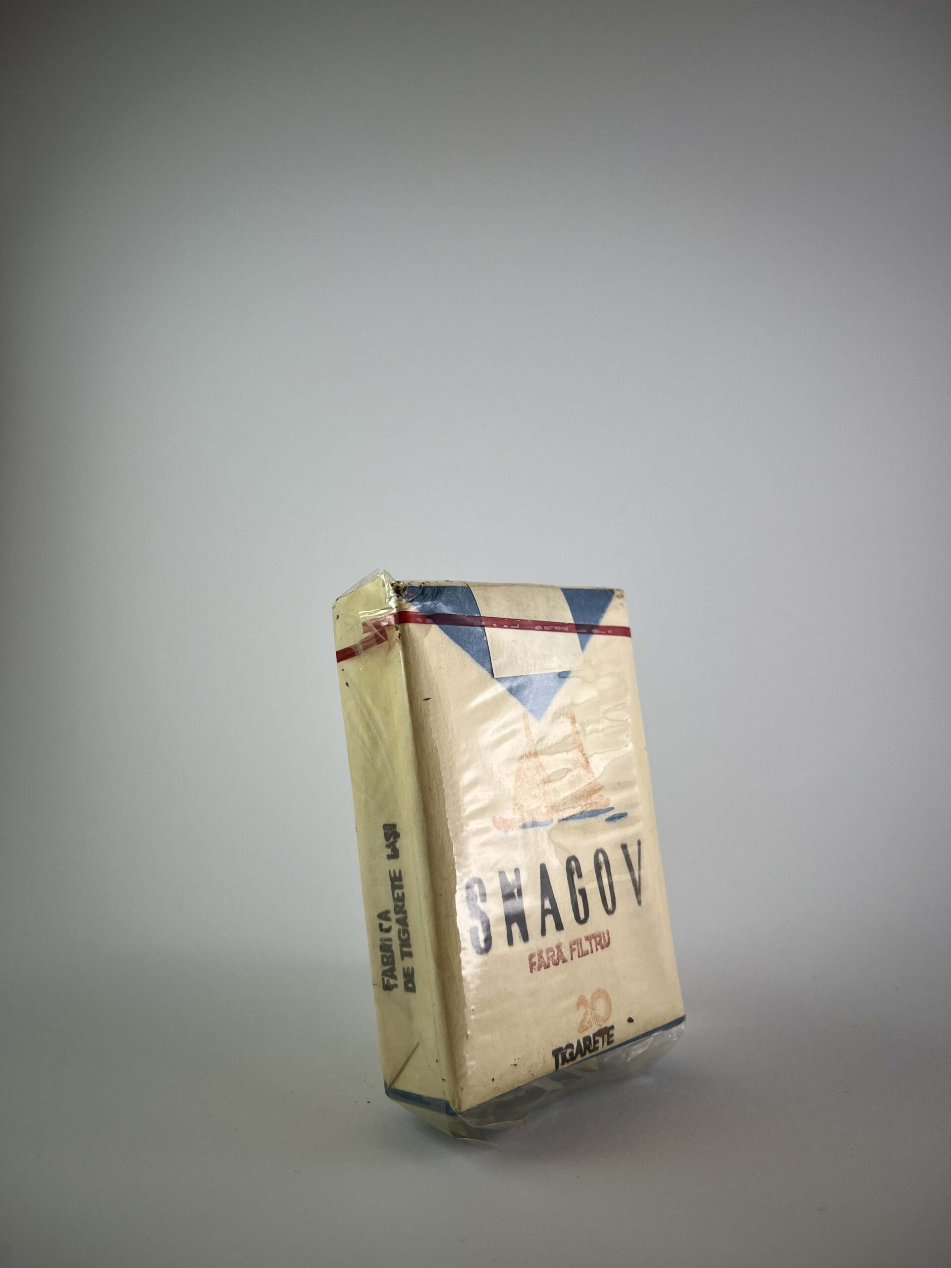 „The Snagov Fără Filtru cigarette pack has a nostalgic, retro design, reflecting the history of Romanian tobacco products. The dominant cream and blue colors with traditional graphic elements convey the aesthetics of classical times. The inscription "Fără Filtru" (without filter) indicates the type of cigarette, while the "Fabrica de Tigarete Iași" logo reinforces the authenticity of this product as a product of the Romanian market. The packaging shows some signs of wear, but is still in its original plastic film.
