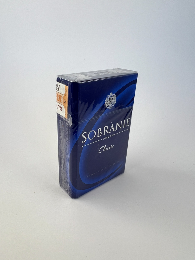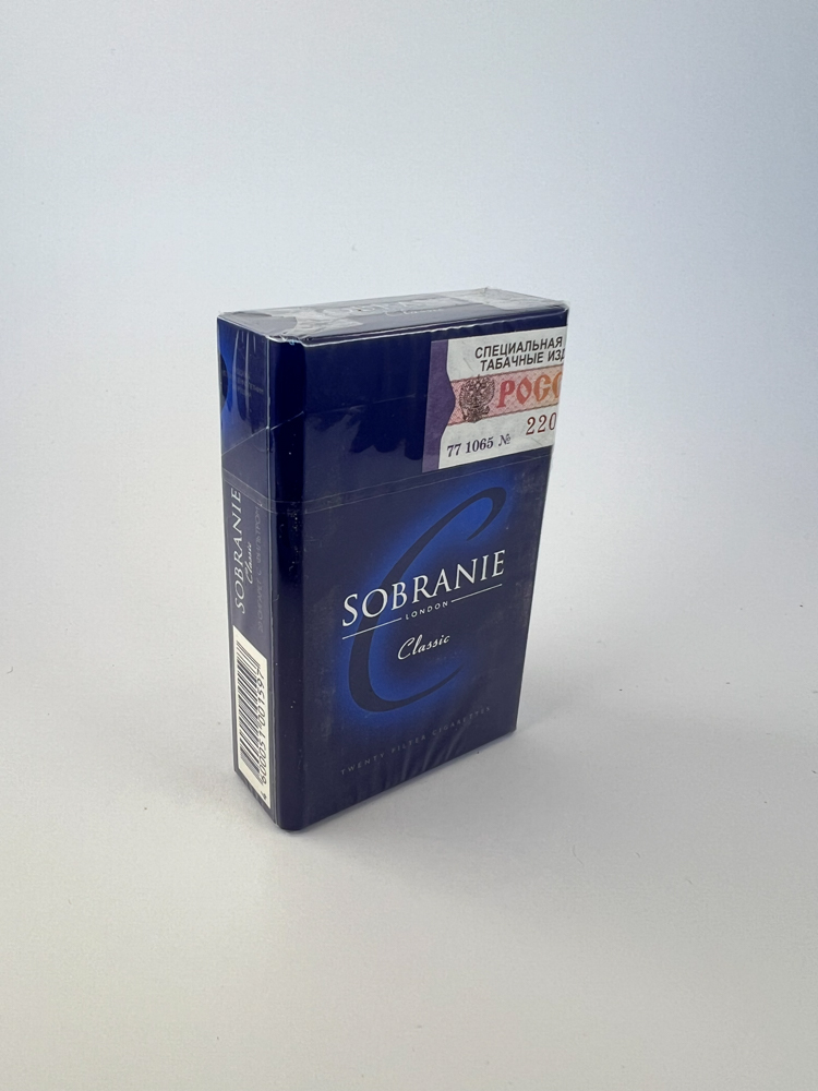 Description: Sobranie Classic is a dark blue cigarette pack with an elegant design, representing one of the more luxurious international brands. The pack is decorated with a minimalist graphic element and a coat of arms, and the inscription "London" refers to the brand originating from Great Britain. A Russian excise sticker is visible on the pack, confirming that this variant was intended for the Russian market. The design is sophisticated, visually oriented towards the higher-class segment. The pack is intact, sealed with the original film.