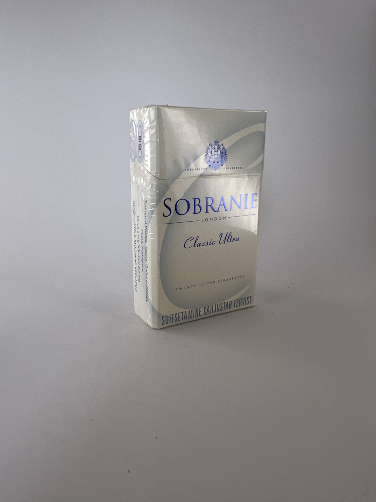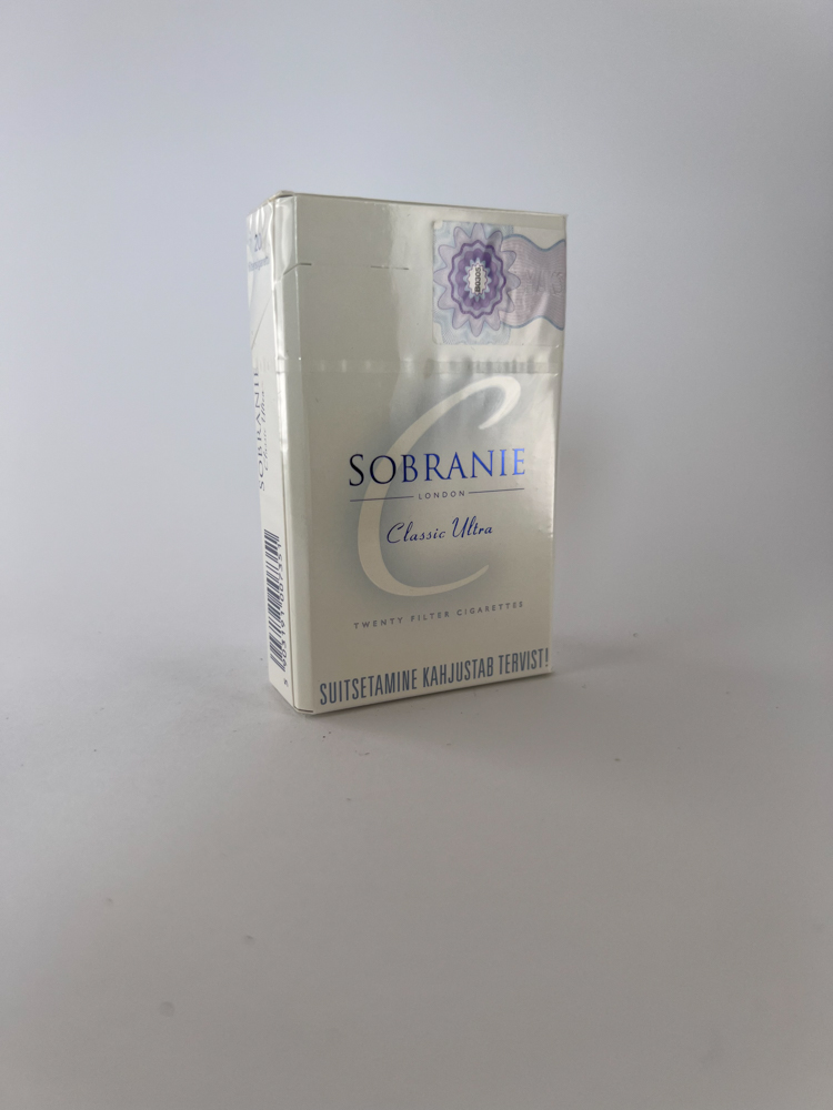 White, minimalist design package with subtle grey and blue elements that highlight elegance. Text clearly visible on the package “"Sobranie London - Classic Ultra"”, as well as a safety warning in Estonian “"Suitsetamine damage health"” indicates that the package was intended for the Estonian market. At the top is an old-style stamp indicating older production.