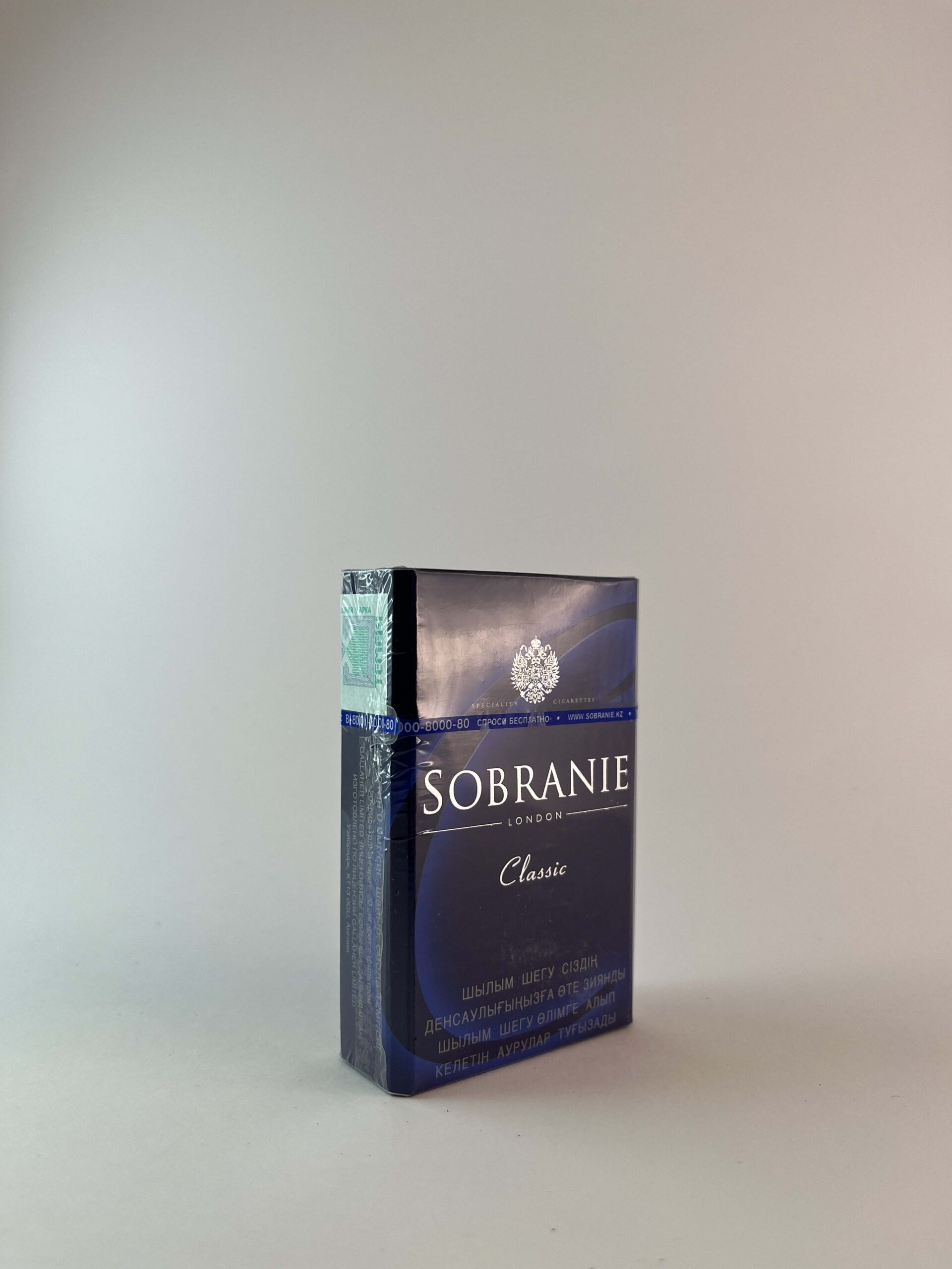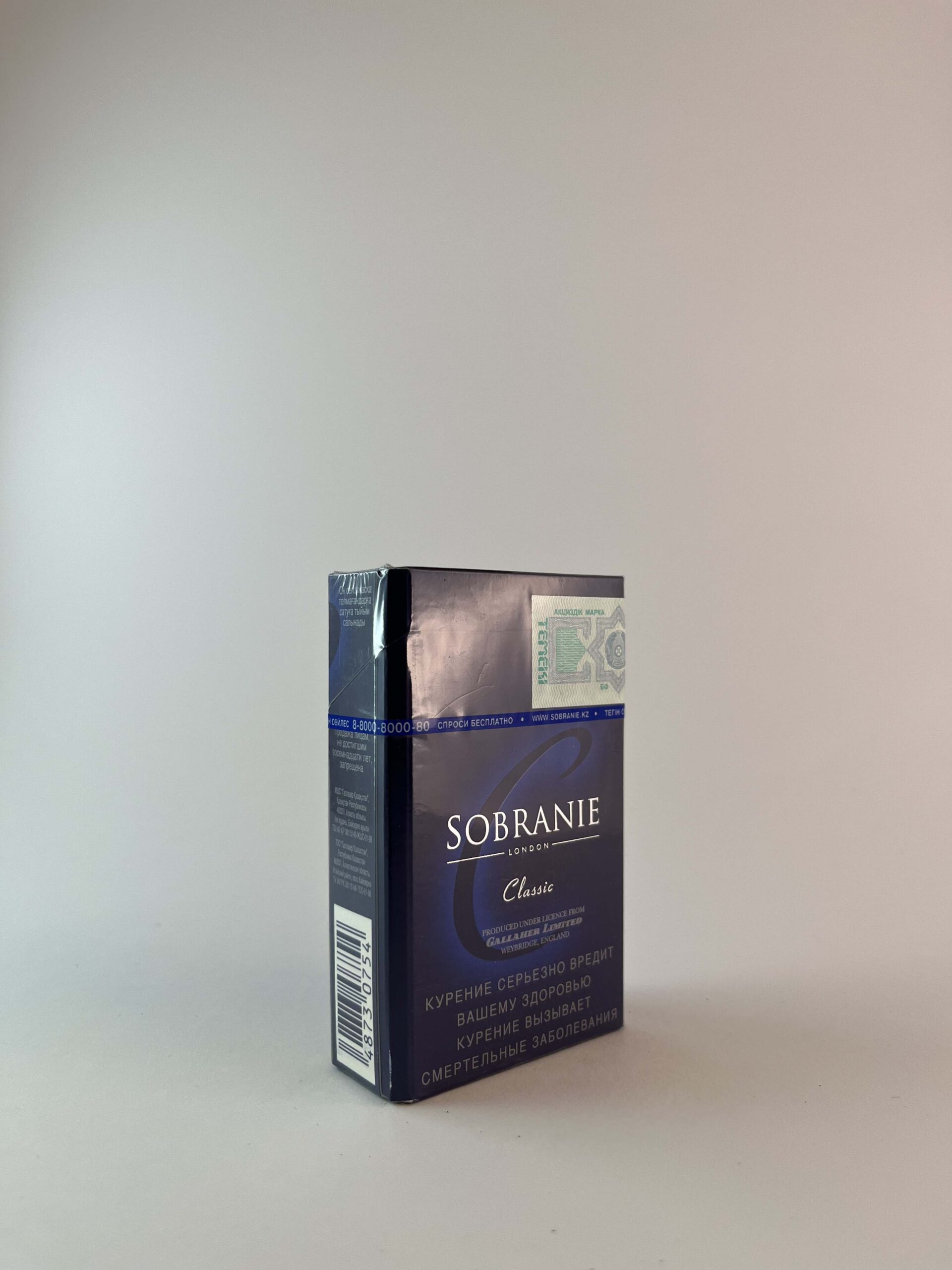 Description: The Sobranie Classic cigarette pack features an elegant, dark blue design with silver and white details. The Sobranie brand is known for its high quality and sophisticated image, and the Classic edition is aimed at those who prefer a stronger taste. The health warning is clearly visible, indicating the health risks of smoking.