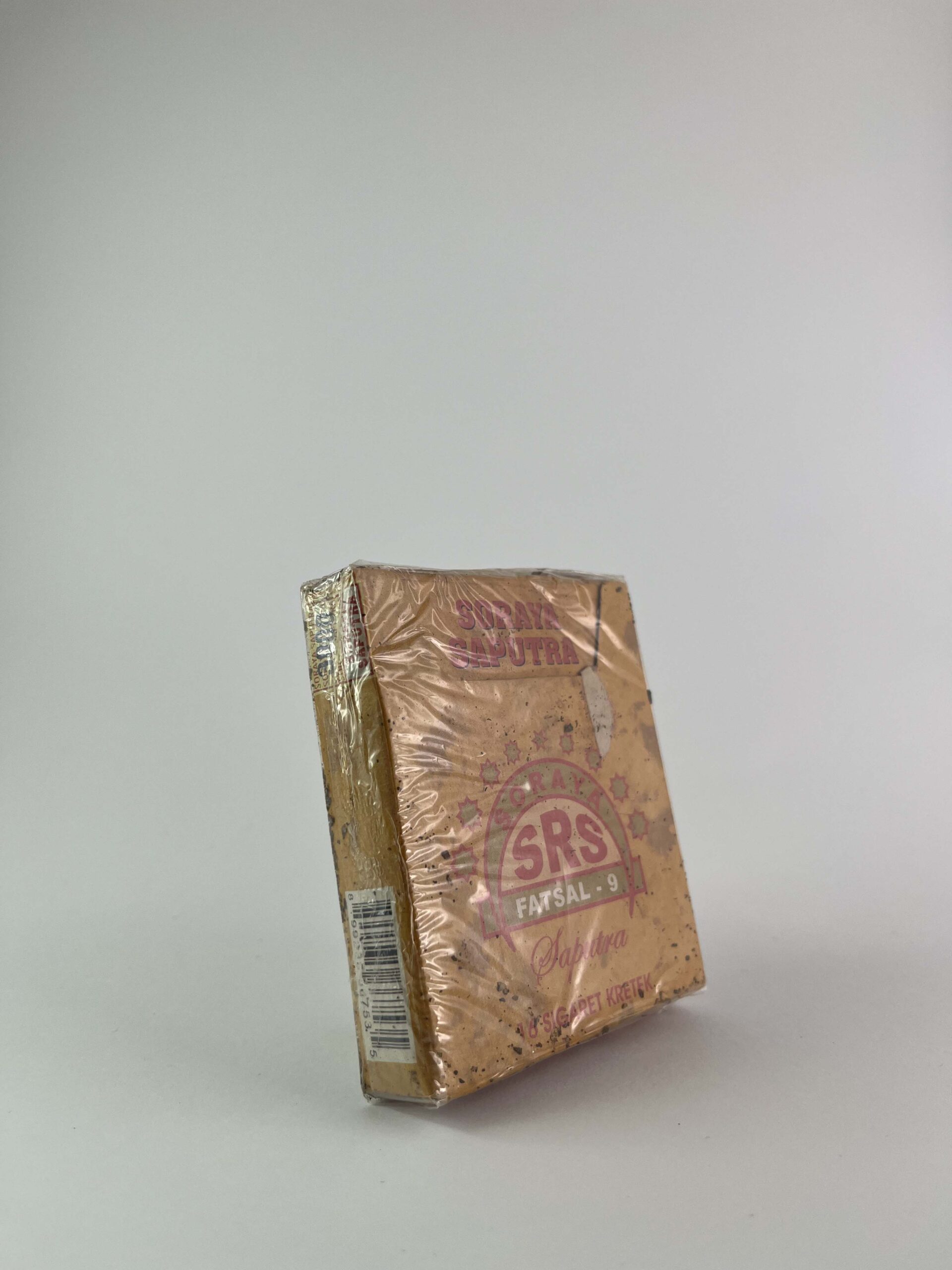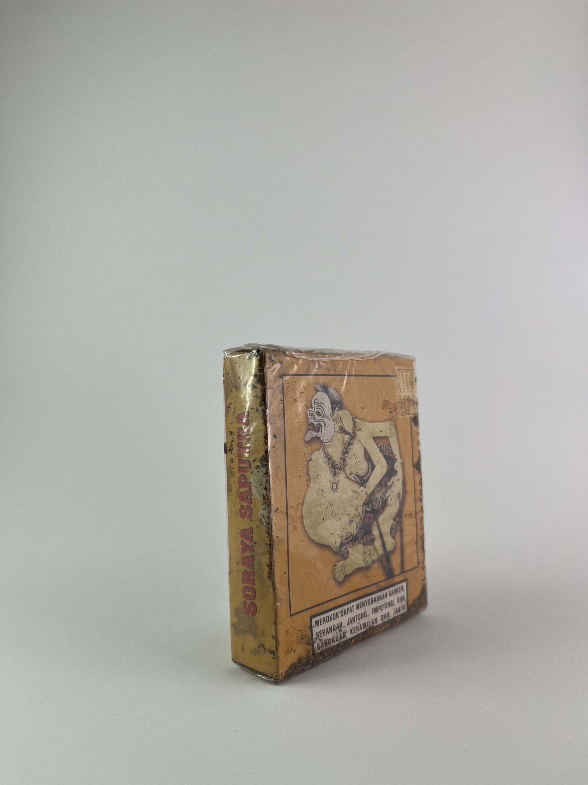 Description: Soraya Saputra cigarečių pakelis pasižymi unikaliu ir meniniu dizainu. Ant pakuotės vaizduojama tradicinė Indonezijos piešinė, kuri perteikia kultūrinį paveldą ir autentiškumą. Pakelio būklė yra prastesnė, matosi dėmių ir nusidėvėjimo ženklų. Įspėjimas apie rūkymo žalą yra aiškiai pavaizduotas, kaip ir daugelyje šiuolaikinių cigarečių pakelių, primenant apie sveikatos pavojus.