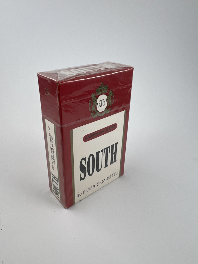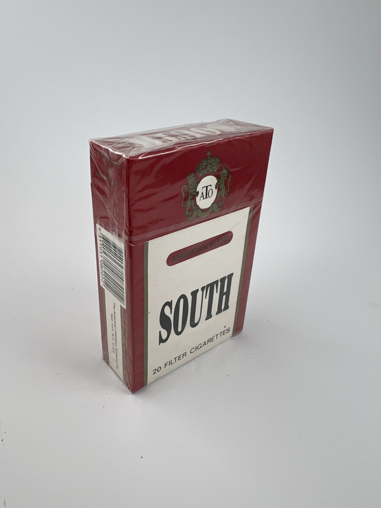 South is a brand of economy-class cigarettes, typical of the post-Soviet market. The design is minimalist, white background with a brightly highlighted name “SOUTH”, at the top – a dark red segment with a coat of arms, typical of Russian and Ukrainian tobacco graphics from the late 20th century. The pack is cellophane-wrapped, neat, and in excellent condition, which is quite rare, because such lower-class packs were usually actively used and today enter the collector's market mostly with defects.