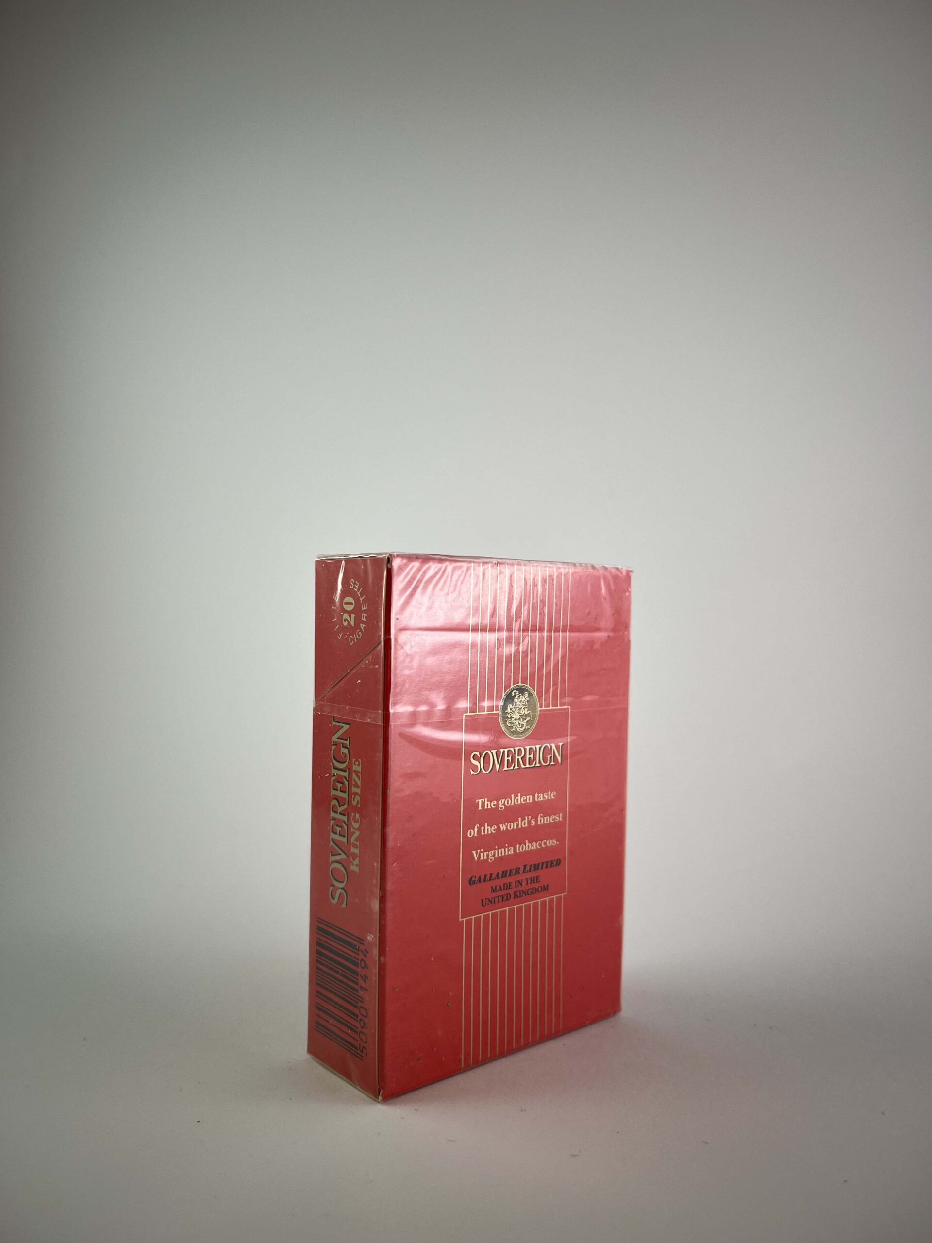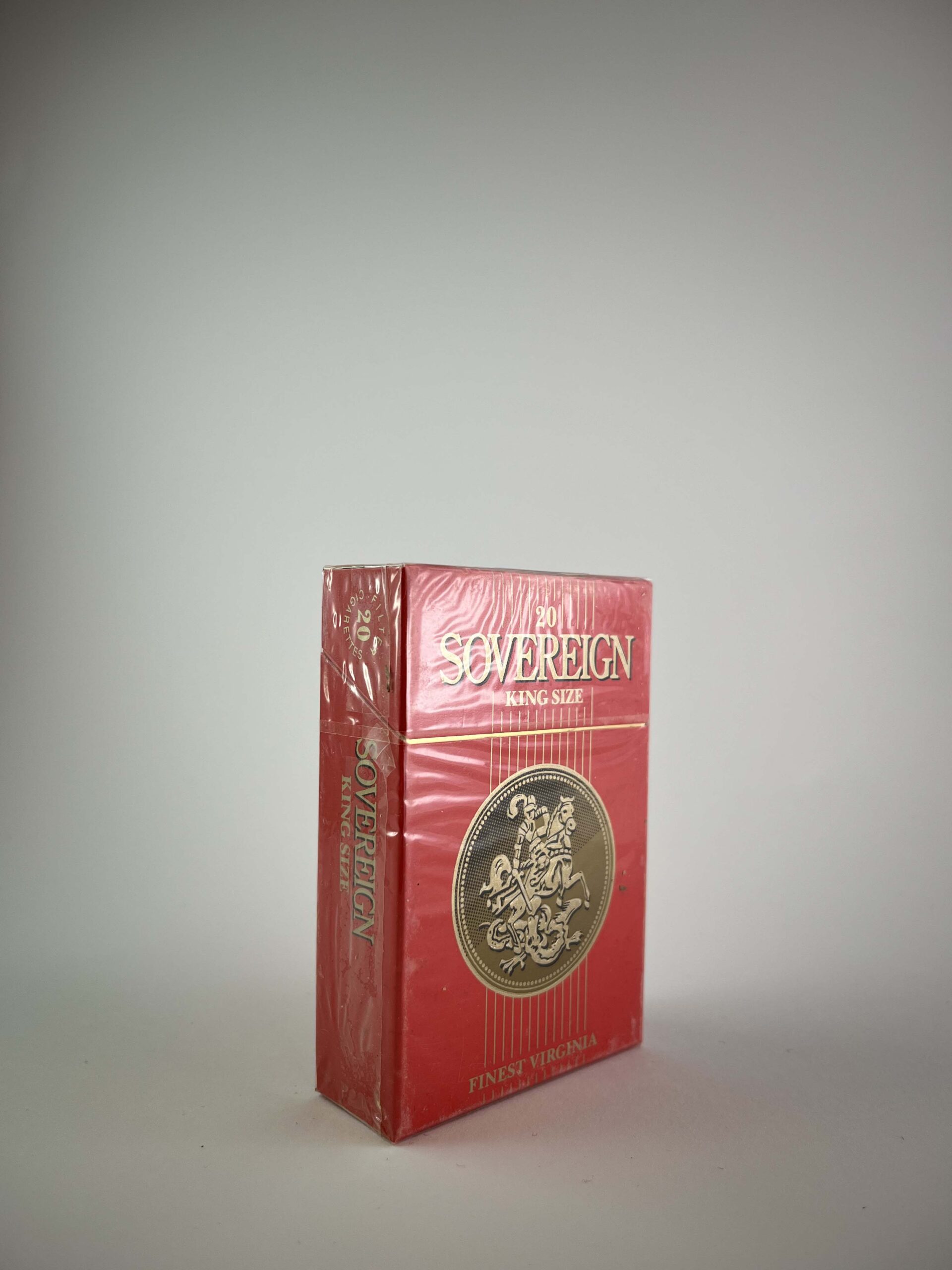 Description: The Sovereign King Size cigarette pack features a bright red color with gold accents that convey a classic and elegant aesthetic. The main side of the pack features a golden knight symbol that gives the pack a distinctive look. The Sovereign brand is known for its high-quality Virginia Tobacco tobacco, and this pack represents the brand's tradition and sophistication. The inscription on the back emphasizes the quality of the tobacco and its production in the United Kingdom.
