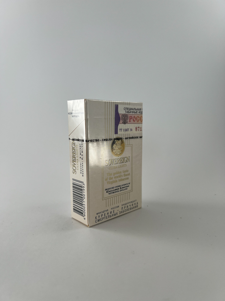 Sovereign Ultra Lights is a premium cigarette pack, created in accordance with the aesthetics of British design and manufactured in Russia under the original license. This pack is distinguished by a combination of gold and white, a classic coat of arms with a lion, and the inscription "Finest Virginia", indicating the quality of tobacco. The front side is dominated by gold printing, emphasizing the prestige of the product. The pack is designed for consumers looking for lighter cigarettes (Ultra Lights), and at the same time an elegant image.