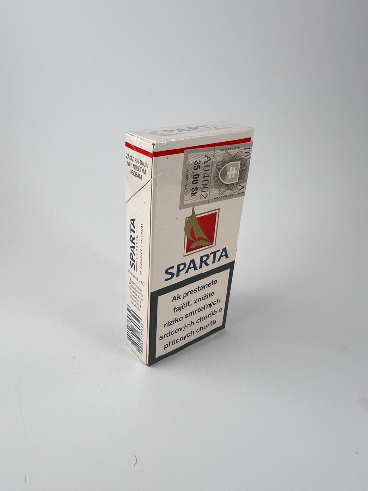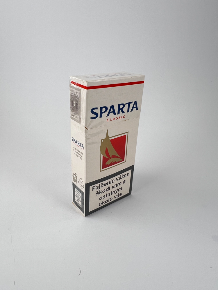 Description: The Sparta Classic cigarette pack has a minimalist but recognizable design – a stylized golden silhouette of a warrior on a red background in the center of a white background. The Sparta Classic logo is visible at the top in blue and red. The warnings about the harm of smoking are in Slovak, and the excise sticker shows a price of 35 SKK (Slovak crowns), which allows us to roughly date the production period to the introduction of the euro in 2009. The pack is intended for the Slovak market.