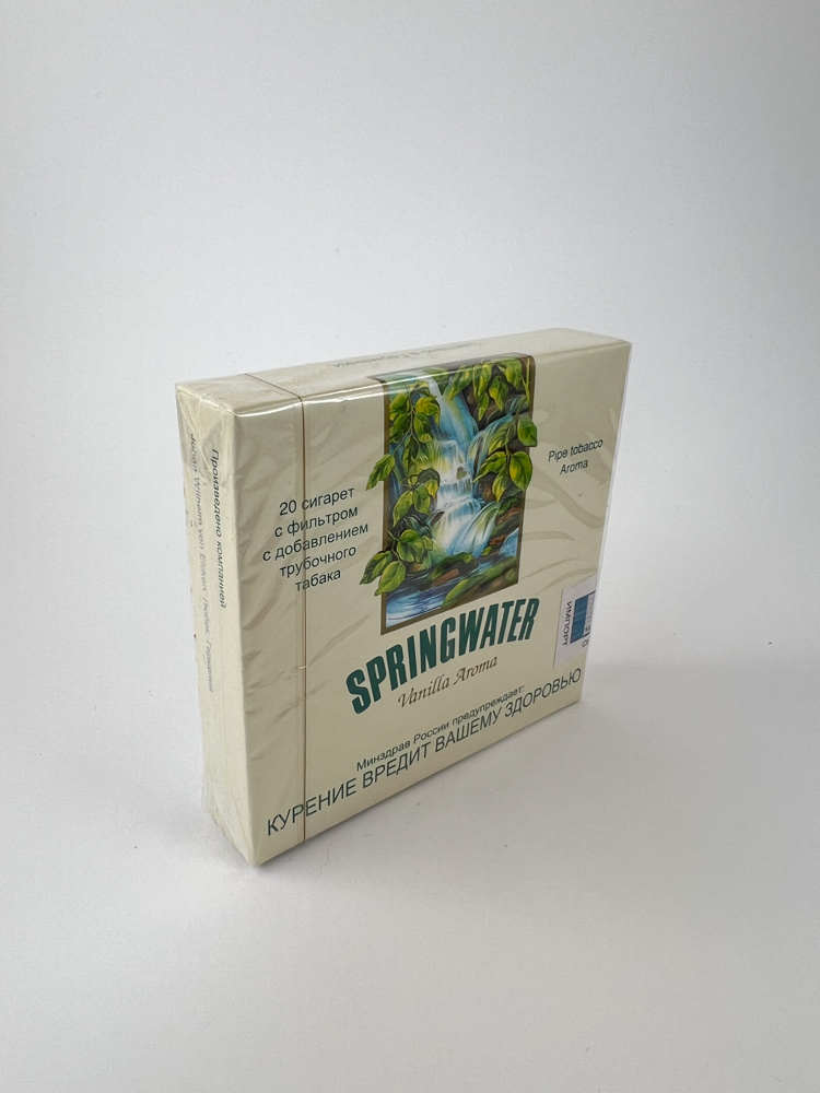 Description: Springwater Vanilla Aroma – tai aromatinės cigaretės su vanilės kvapu, pagamintos su pypkiniu tabaku. Pakelis turi šviesų, beveik baltą foną, dekoruotą stilizuotu krioklio piešiniu bei žalių lapų motyvais. Šone aiškiai nurodytas kvapas – „Pipe tobacco aroma“. Pakelis skirtas Rusijos rinkai – tai patvirtina rusiškas įspėjimas apie rūkymo žalą, valstybinė banderolė bei atitinkami registracijos žymenys. Šis egzempliorius yra ne tik estetiškai išskirtinis, bet ir teminis – aromatiniai leidimai tampa vis paklausesni kolekcinėje rinkoje.