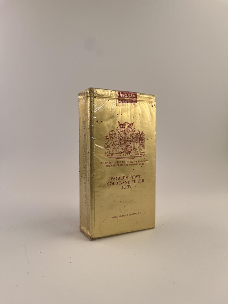 On the back side - gold background with inscription World's First Gold Band Filter 100's, emphasizing the luxury and innovation of the product.