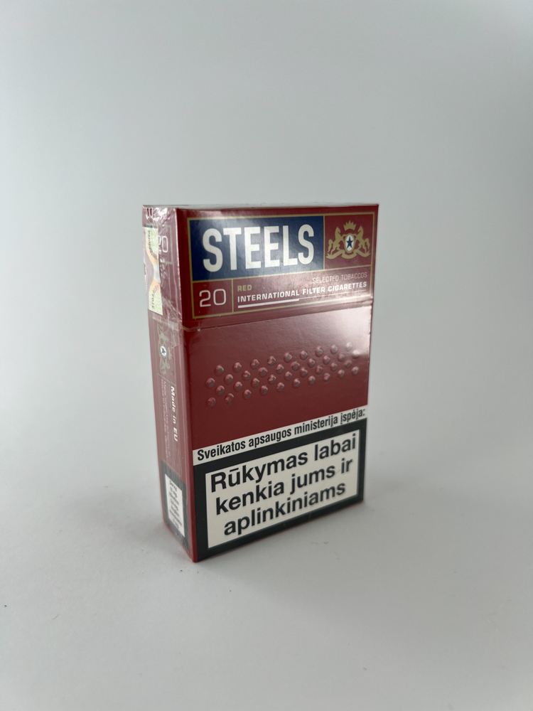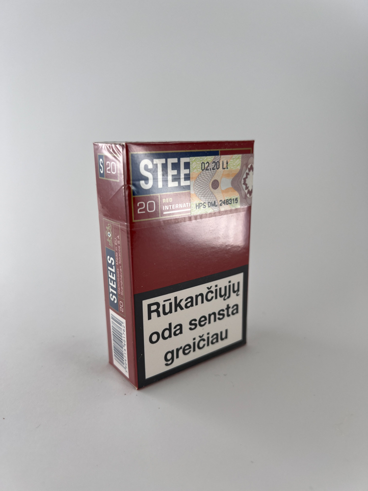 STEELS Red yra mažai žinomas prekės ženklas, siūlęs tarptautinius filtrinius tabako gaminius. Pakelis klasikinio stačiakampio formos, su ryškiai raudona spalva, baltu STEELS logotipu mėlyname fone ir minimalistiškai pateikta informacija. Tai aiškiai ekonominės klasės produktas, skirtas vietiniam Lietuvos (ir/ar kitų Baltijos šalių) vartotojui. Ant viršutinės dalies matomas akcizinis lipdukas su kaina litais (2,20 Lt), o įspėjimai pateikti lietuvių kalba.