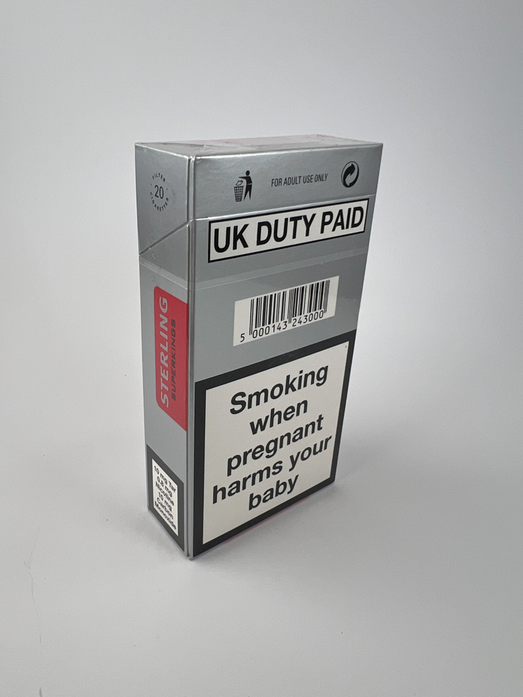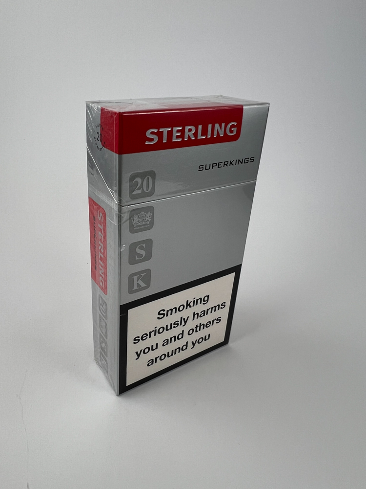 This is a classic Sterling brand pack for the UK market. It comes in a silver hard pack with a red logo on top and a clear „SUPERKINGS“ label. The front side has the warning „Smoking seriously harms you and others around you“ and the back side has the warning „Smoking when pregnant harms your baby“. These cigarettes were aimed at fans of the longer format (superkings), and the pack design complies with the British tobacco product labelling requirements after 2000.