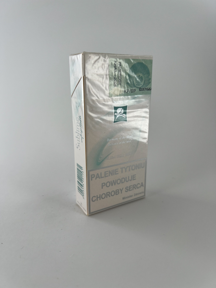 „Sublime Menthol is an elegantly designed cigarette pack with a menthol accent on a light pearlescent background. The front and back of the pack feature subtle graphic solutions with the symbolism of a green leaf. The name clearly emphasizes „Slim Size 100's’, which indicates that these are longer and narrower cigarettes intended for a niche market. The pack shows a Polish excise stamp with the date 2004. The warnings are in Polish: „"Palenie tytoniu voodoo raka"”, „"Palenie tytoniu provoduje sorky serca"”, front and rear respectively.