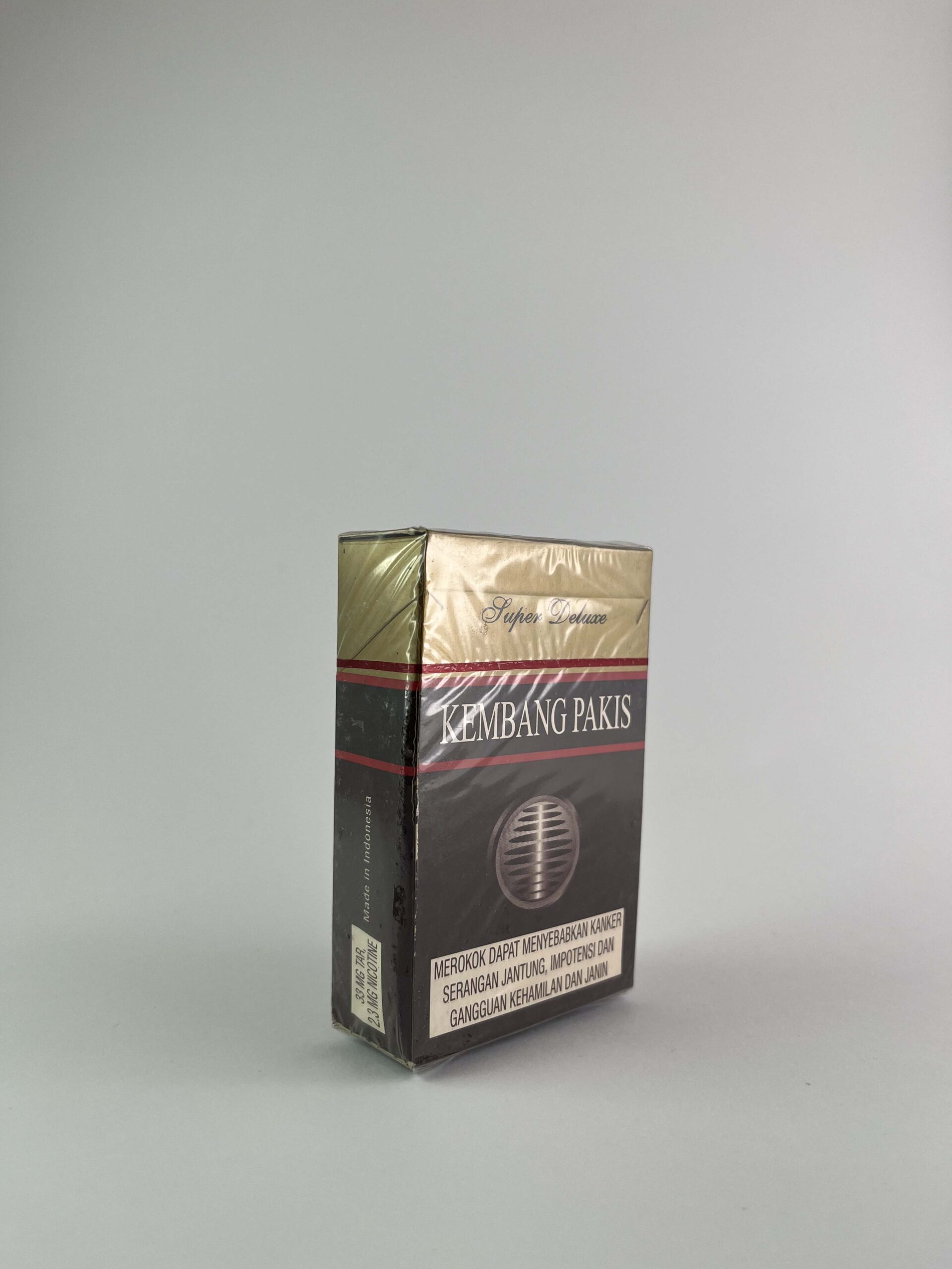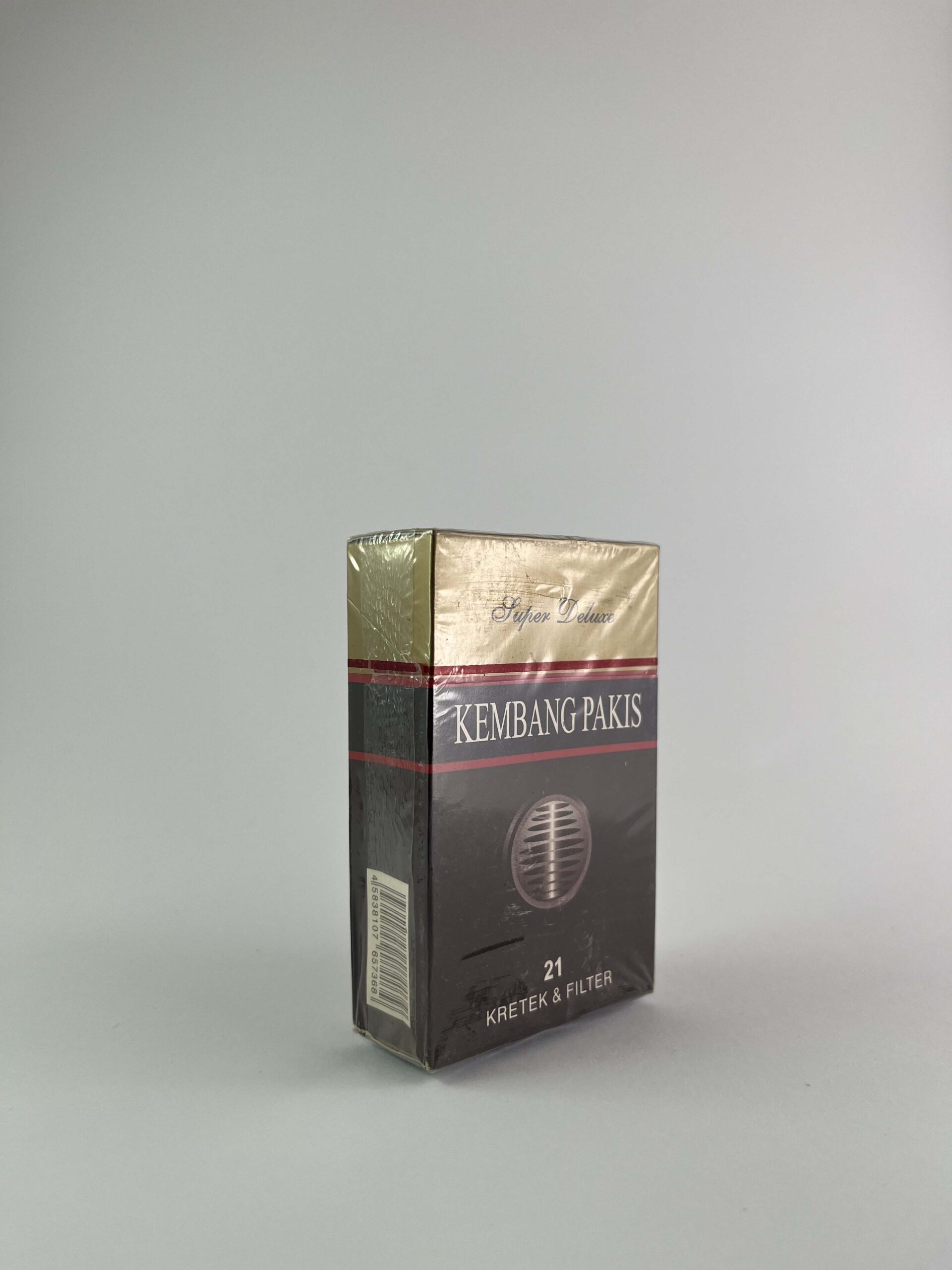 Description: This pack of Kembang Pakis cigarettes, marked "Super Deluxe", reflects the Indonesian tobacco culture, especially the tradition of "kretek" cigarettes. The design is elegant and luxurious, maintaining a dark and solid style that is suitable for premium products. The packs of this brand are known for their high quality and distinctive taste, which are appreciated both in the local and international markets.