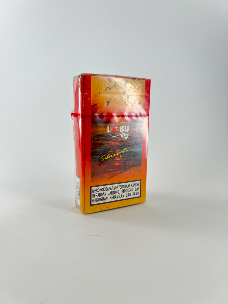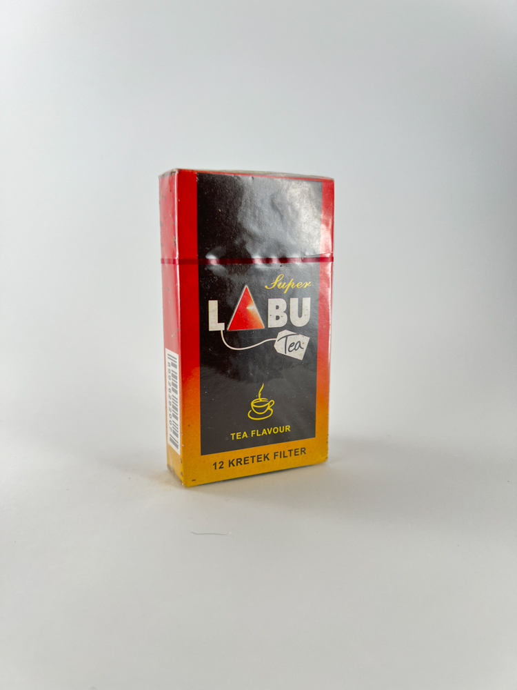 Description: This Super LABU Tea pack is one of the more exotic Indonesian kretek cigarettes, featuring tea-flavored filtered cigarettes. The pack design is colorful - dominated by red and orange tones with a stylized illustration of a tea cup and the inscription "Tea Flavour". Warnings about the harm of smoking are presented in Indonesian, indicating the harmful effects on health. This pack is intended for the local market and is a rare collector's item outside Indonesia.