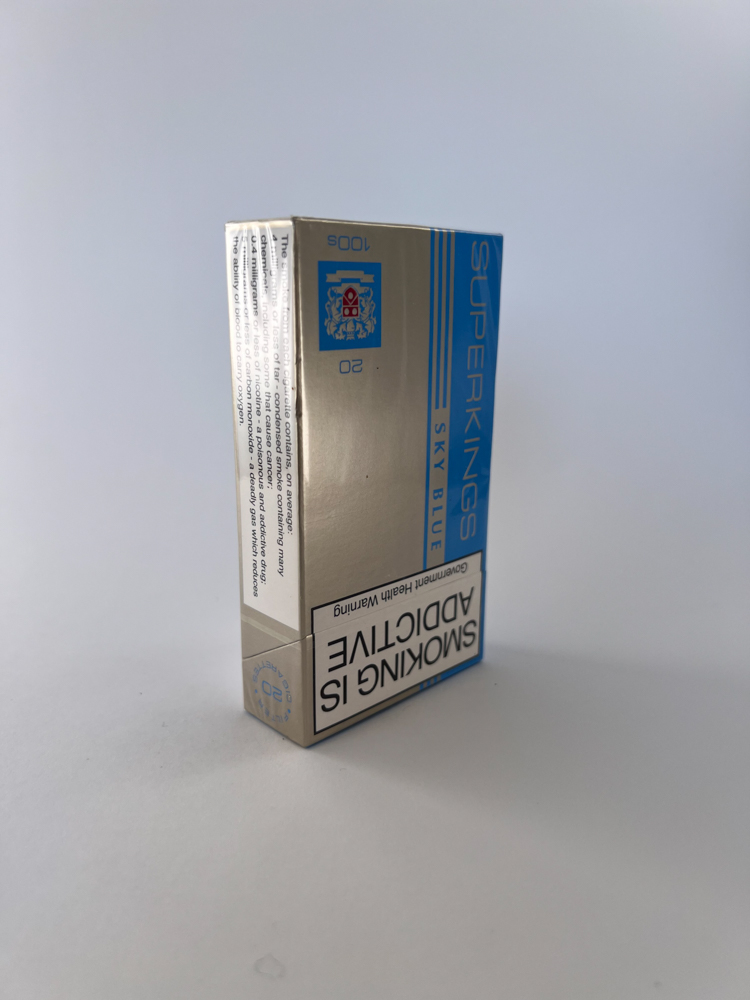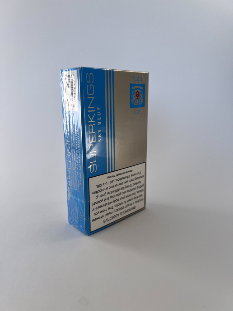 Superkings Sky Blue 100's are elongated, "lighter" cigarettes from Great Britain, characterized by a modern, minimalist design. The silver background with bluish accents and the inscription "100's" suggests a longer format. The "Sky Blue" version indicates that this is a lower strength alternative. The pack has the standard British warning "Smoking is addictive" with a frame typical of British regulations of the 2000s. The pack is intact, in its original film.