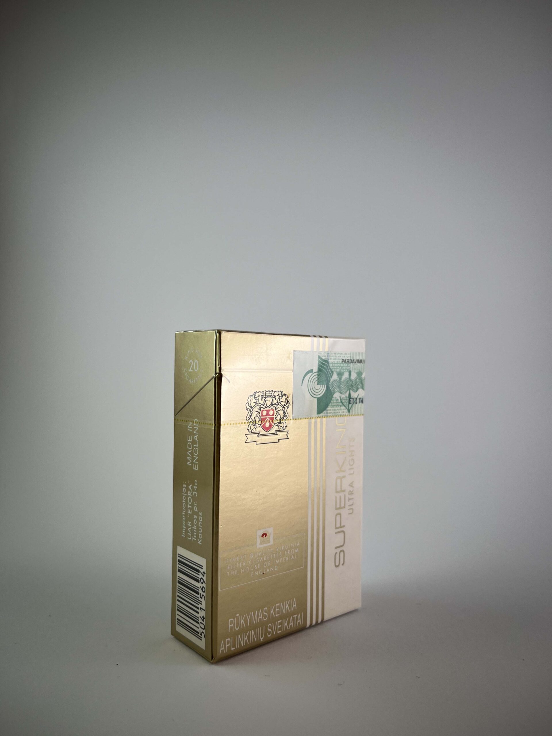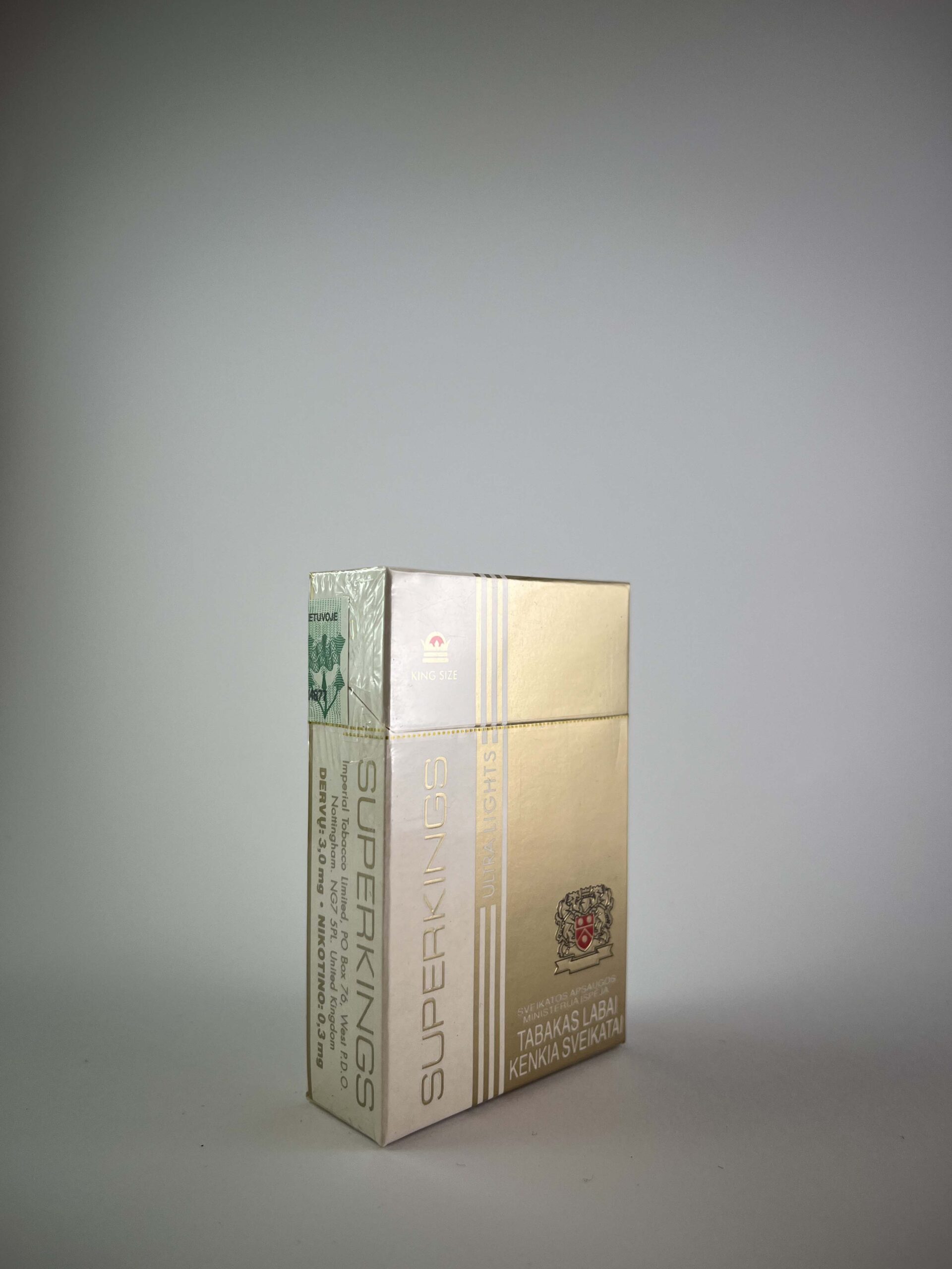 Superkings cigarettes have been popular as a longer and more luxurious alternative to traditional formats. This pack, designed for the Lithuanian market, stands out for its uniqueness and preserved quality.