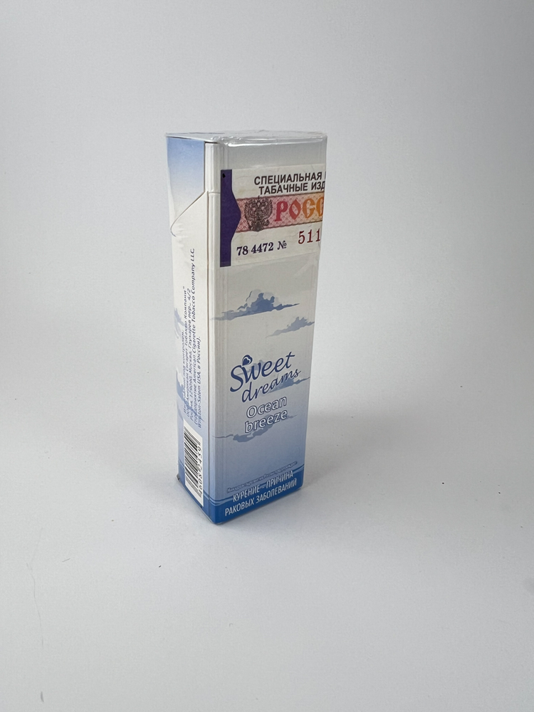 Description: Sweet Dreams Ocean Breeze – tai aromatizuotos cigaretės, orientuotos į jaunatvišką ir moterišką auditoriją. Pakelis pasižymi švelniomis mėlynomis ir baltais atspalviais, perteikiančiais gaivos ir pajūrio tematiką. Priekinėje dalyje – iliustracija su moters atvaizdu ir užrašu „Ocean breeze“. Ant pakelio nurodyti įspėjimai apie rūkymo žalą rusų kalba bei matomas Rusijos akcizo ženklas. Tokie pakeliai neretai turi saldų, gaivų skonį, o jų išvaizda išsiskiria iš tradicinių dizainų.