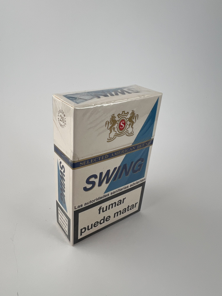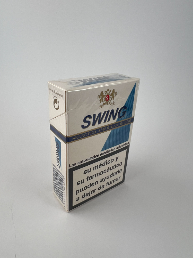 Description: The Swing Selected American Blend cigarette pack from Spain stands out with a clean white background, complemented by blue graphics and a coat of arms-style logo with the letter "S". The pack features Spanish health warnings: "fumar puede matar" ("smoking can kill") and "su médico y su farmacéutico pueden ayudarle a dejar de fumar" ("your doctor and pharmacist can help you quit smoking"), clearly indicating that this pack was intended for the Spanish market. The design is simple but solid, conveying the style of an American tobacco blend. The pack is unopened, with its original transparent film.