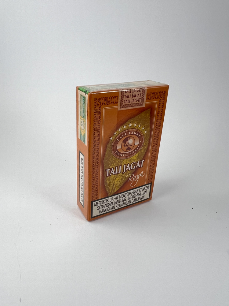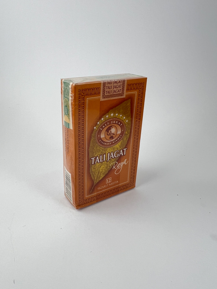 Description: Tali Jagat Raya – tai kretek tipo cigarečių pakelis iš Indonezijos, pasižymintis šiltu oranžiniu atspalviu ir dekoratyviniu rėmeliu aplink centrinę grafiką. Pakuotėje pavaizduotas tabako lapas ir tradicinis logotipas su žvaigždėmis, taip pat įrašas „Citarasa Nusantara“ (liet. „Indonezijos skonis“), pabrėžiantis nacionalinę identitetą. Įspėjimas apie rūkymo žalą pateiktas indoneziečių kalba. Šis gaminys skirtas vidaus rinkai, ir jame tikėtina yra tabakas su gvazdikėliais ir prieskoniais, kaip būdinga kretek cigaretėms.