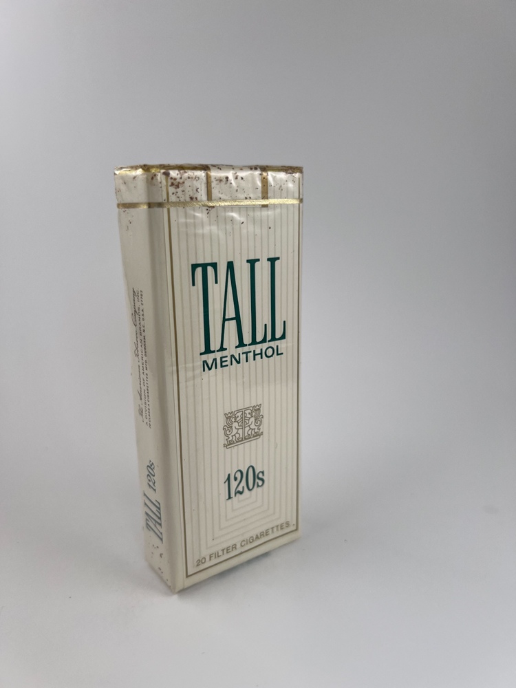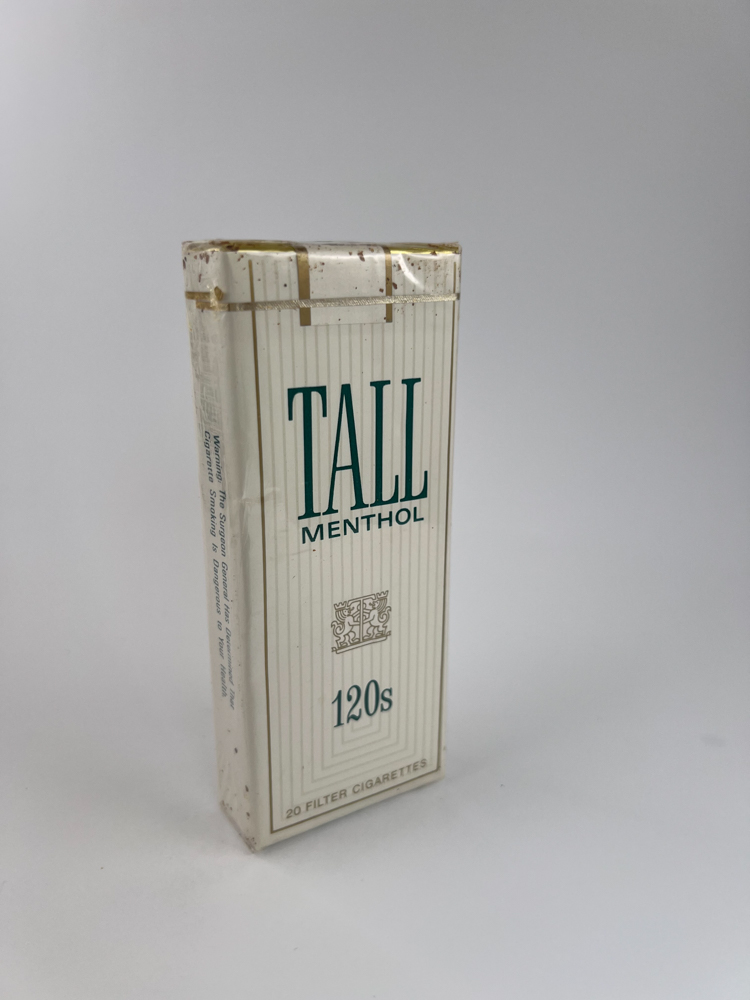 Tall Menthol 120s are elegantly designed long (120 mm) menthol-flavored cigarettes made for the US market. The pack is white with fine vertical lines, a minimalist logo and the greenish inscription "TALL MENTHOL". The center of the pack features a decorative heraldic symbol. This pack reflects the aesthetics of late 20th century US cigarettes - clean, understated and exclusively intended for a sophisticated female audience. The US health warning ("Surgeon General's Warning") is clearly visible on the side, and the pack itself is tightly sealed with cellophane, but with partial signs of surface oxidation (spots) due to age.