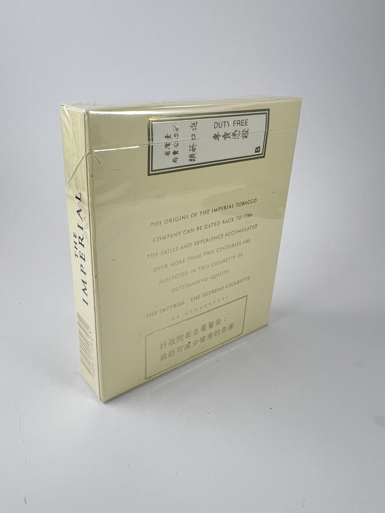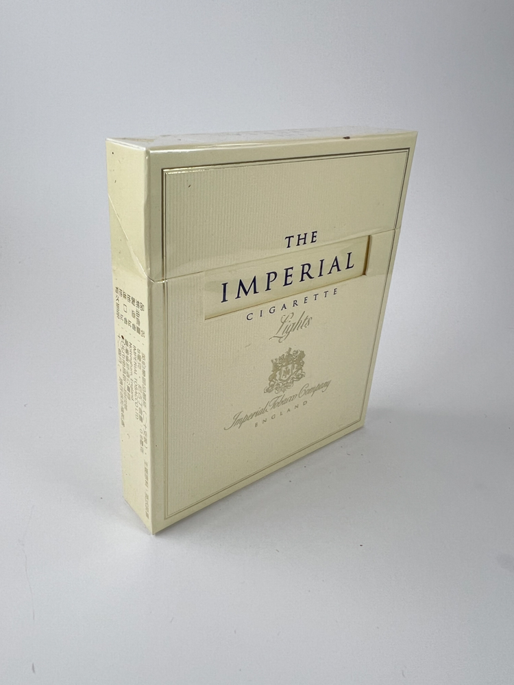 Description: Cream-colored pack with a minimalist design. On the front – the inscription „The Imperial Cigarette Lights“, the coat of arms with „Imperial Tobacco Company England“. On the back – text about the company’s origins since 1786, emphasizing more than 200 years of experience. On top – a duty-free sticker with Chinese inscriptions. The pack is unpacked, the cellophane is neat, small spots on the surface.