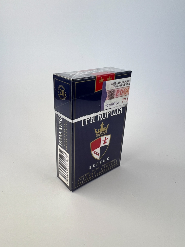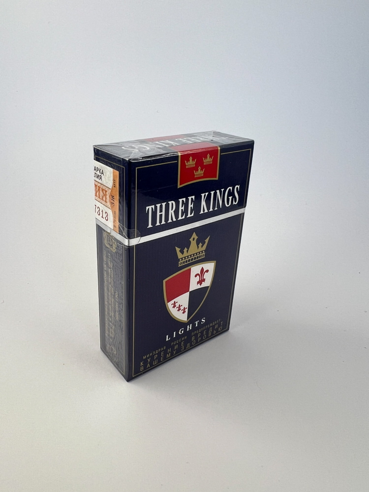 Description: The Three Kings Lights cigarette pack is distinguished by its dark blue color with a heraldic-style shield and crown symbol. The design is focused on a classic and authoritative image. The logo and name are repeated on the top and sides in English and Russian. The warning about the harm of smoking is presented in Russian, indicating that this is a product intended for the Russian market.