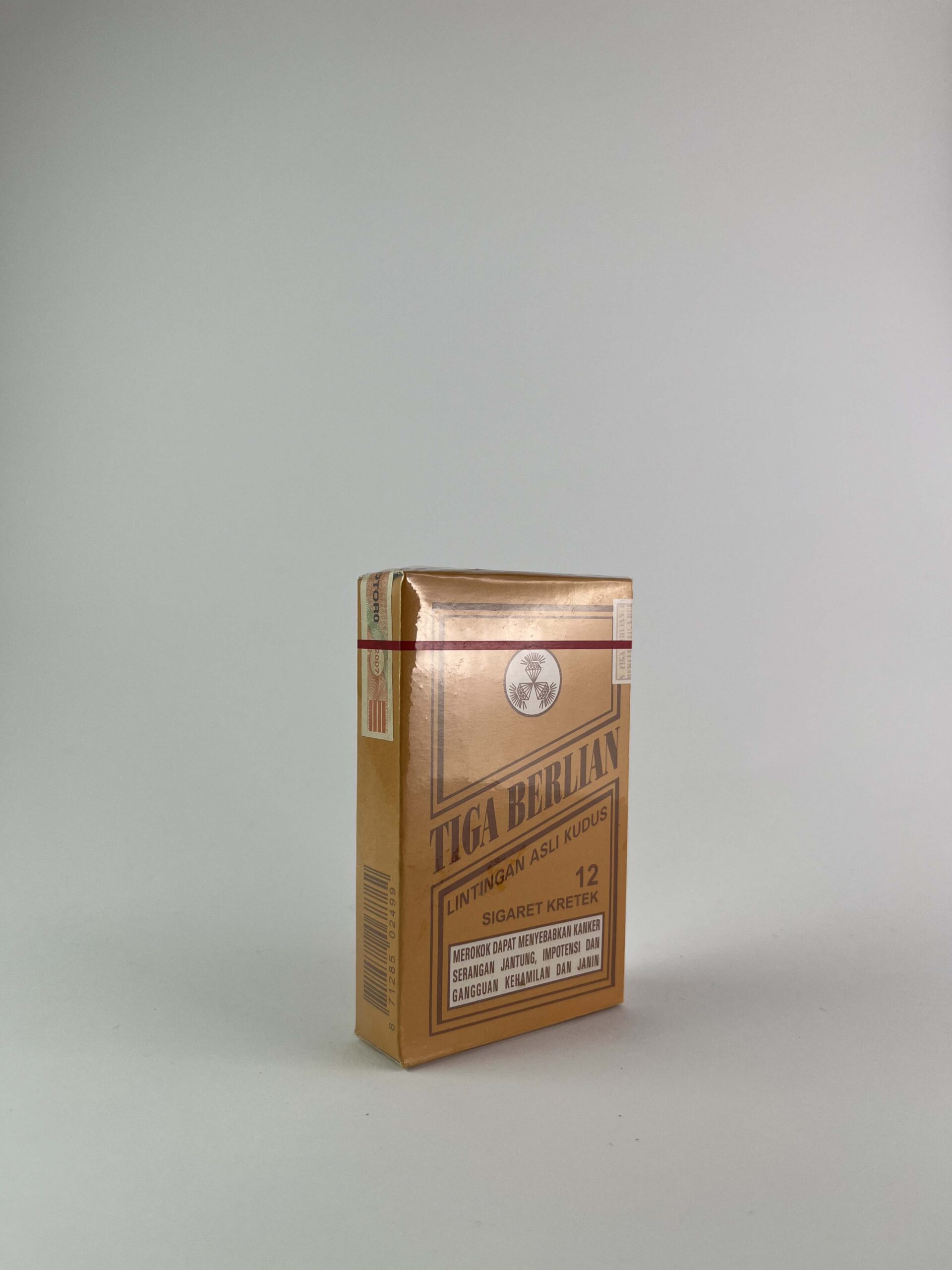 Aprašymas: Tiga Berlian cigarečių pakelis iš Indonezijos su tradiciniu kretek cigarečių dizainu. Pakelis papuoštas aukso spalva su akcentuotu logotipu ir Indonezijos gamintojų ženklais. Įspėjimas apie rūkymo žalą pateiktas pakelio apačioje, ryškiai išryškinant sveikatos pavojus. Dizainas primena senąją kretek cigarečių estetiką, kuri populiari tarp kretek mėgėjų.