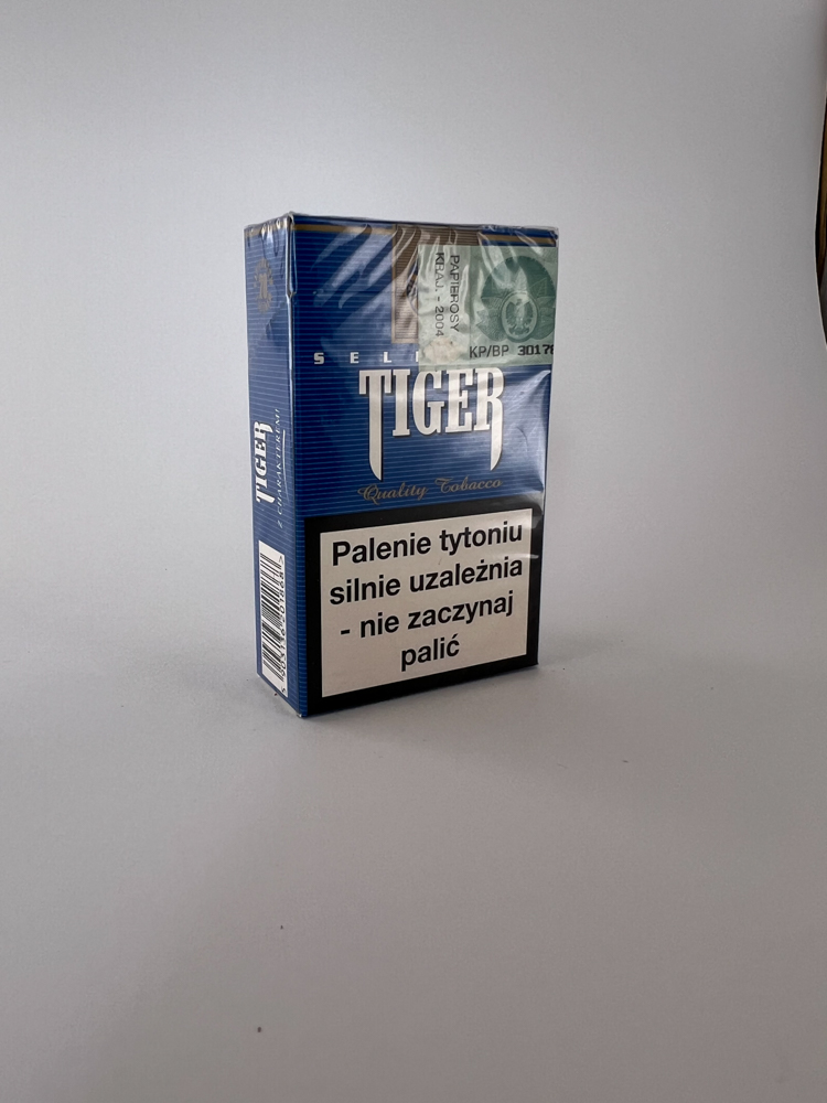 „Tiger Selected“ cigarečių pakelis pasižymi tamsiai mėlynu fonu su baltomis raidėmis, perteikiančiomis stiprų, vyrišką įvaizdį. Viršutinėje dalyje pavaizduotas tigro galvos simbolis, simbolizuojantis stiprumą ir kokybę. Apatinė dalis pažymėta užrašu „Quality Tobacco“. Įspėjimai apie rūkymo žalą pateikti lenkų kalba, o akcizo lipdukas taip pat rodo, kad tai yra Lenkijos vidaus rinka.