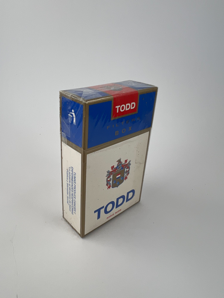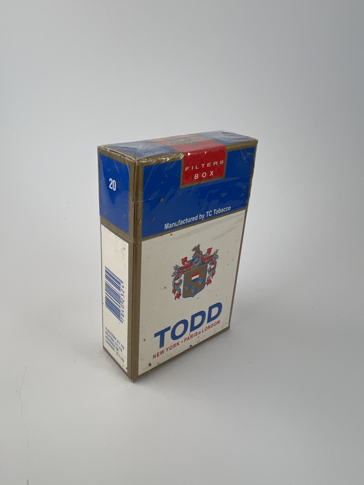 „The TODD Filters Box cigarette pack has a classic, solid design - the upper part is dark blue with a red logo, and the lower part is white. The coat of arms with the Dutch flag is depicted in the center, and the three world capitals - "New York · Paris · London" - are highlighted at the bottom, which are used for marketing purposes. Visually, the pack creates an image of European prestige, although the actual production took place in Lebanon. The inscription "King Size" indicates a longer format. Manufacturer - TC Tobacco, a company operating in Lebanon, known for its goods intended for export.